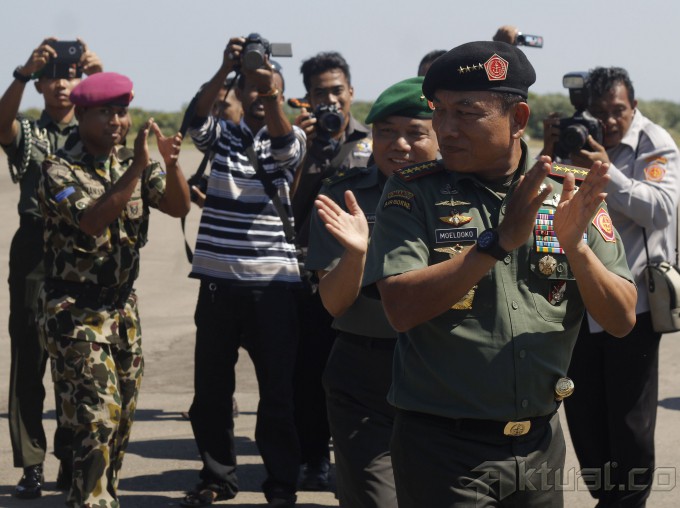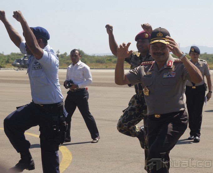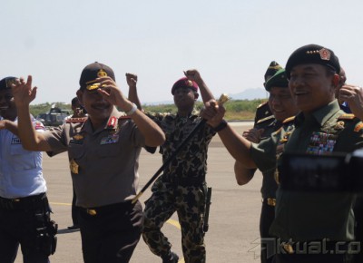 Panglima TNI Jenderal Moeldoko (kanan) dan Kapolri Jenderal Pol Badrodin Haiti (kini ) menari tarian Ja’i bersama sejumlah Prajurit TNI dan Polri saat tiba di Kupang, dalam rangka kunjungannya ke wilatah perbatasan RI-Timor Leste di Mota’ ain Atambua, NTT, Kamis (7/5/2015). Panglima TNI dan Kapolri melakukan kunjungannya ke wilayah perbatasan RI-Timor Leste untuk melihat secara langsung kehidupan prajurit-prajurit di wilayah itu. ANTARA FOTO/Kornelis Kaha