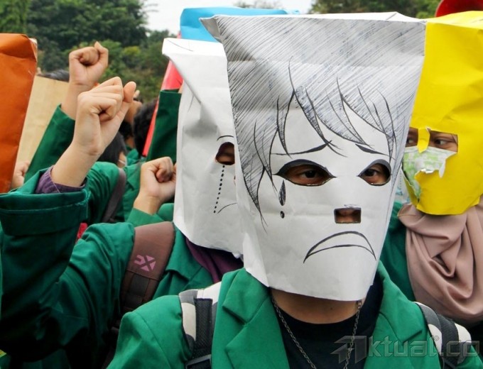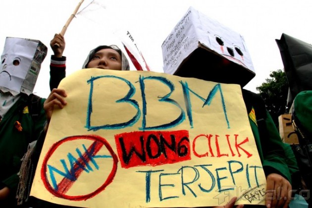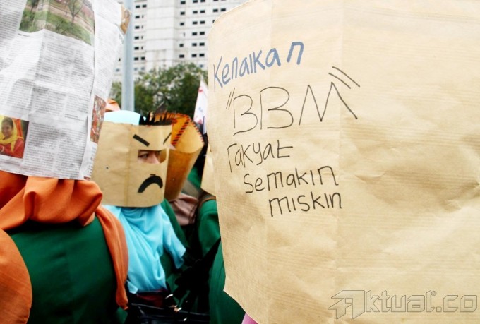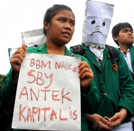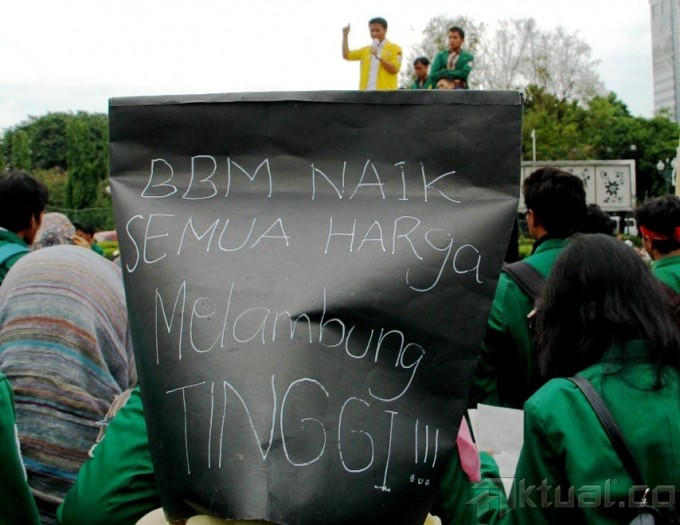 Sejumlah mahsiswa yang tergabung dalam Badan Eksekutif Mahasiswa (BEM) Se-Jabodetabek Banten melakukan aksi menolak rencana pemerintah menaikan harga Bahan Bakar Minyak (BBM) bersubsidi di depan Istana Negara, Jakarta, Rabu (12/6). Selain menolak kenaikan BBM, para mahasiswa meminta kepada pemerintah untuk menasionalisasi aset bangsa, khususnya minyak bumi, serta meningkatkan kesejahteraan rakyat. Aktual/Oke Dwi Atmadja