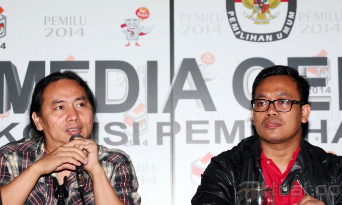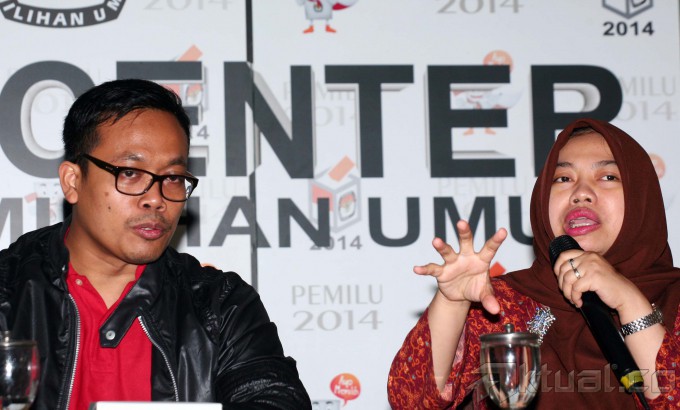Dari kiri ke kanan, Manager Sayu Dunia Anwari Natari, Lembaga kemitraan Pemilu Agung, Perludem Titi Anggraini dan Pekerja seni Melanie Subono, saat peluncuran website pemilubersih.org di gedung Komisi Pemilihan Umum (KPU), Jakarta, Jumat (6/6/2014). Website ini ditujukan menjadi salah satu media untuk memperkuat gerakan membangun proses demokratisasi oleh warga. Karena, melalui website ini, warga diberdayakan untuk ikut aktif langsung memantau penyelenggaraan Pemilu 2014. Aktual/Tino Oktaviano