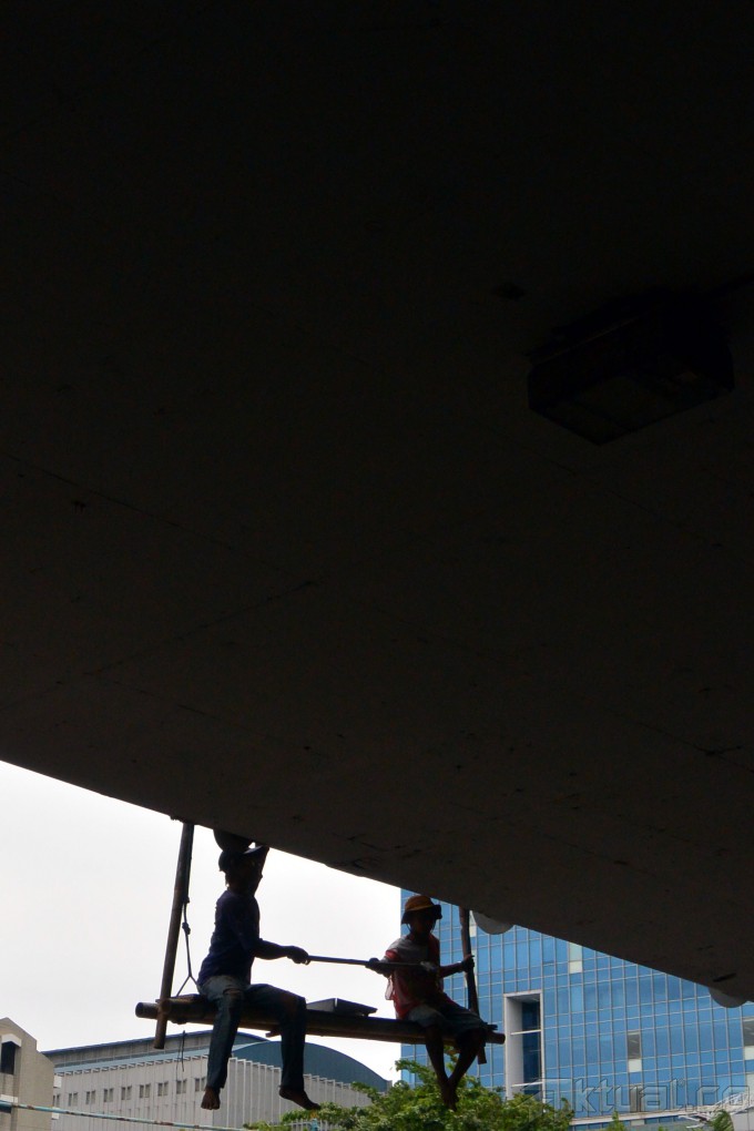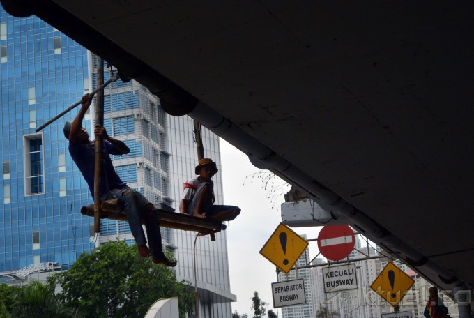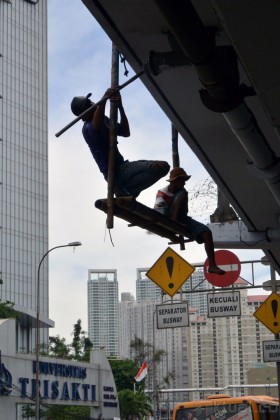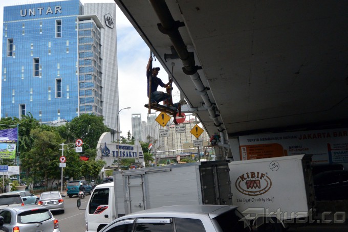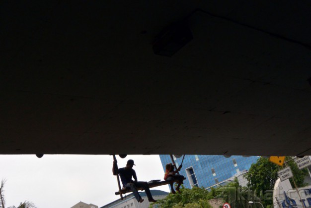 Pekerja melakukan perawatan jalan layang di kawasan Tomang, Jakarta Barat, Rabu (20/11/2013). Perawatan rutin yang dilakukan Pemprov DKI Jakarta melalui Dinas Pekerjaan Umum ini guna menjaga kebersihan dan keindahan infrastruktur yang ada dikota Jakarta, mulai dari pembersihan dan mengecat seluruh tembok jalan layang dan jembatan. Aktual/Tino Oktaviano