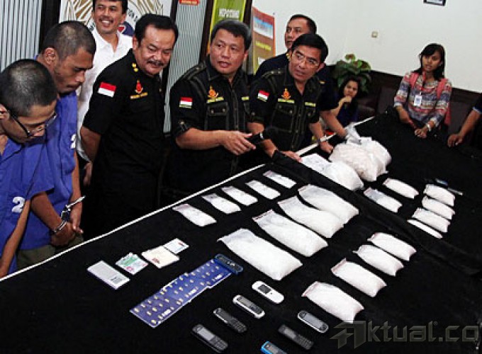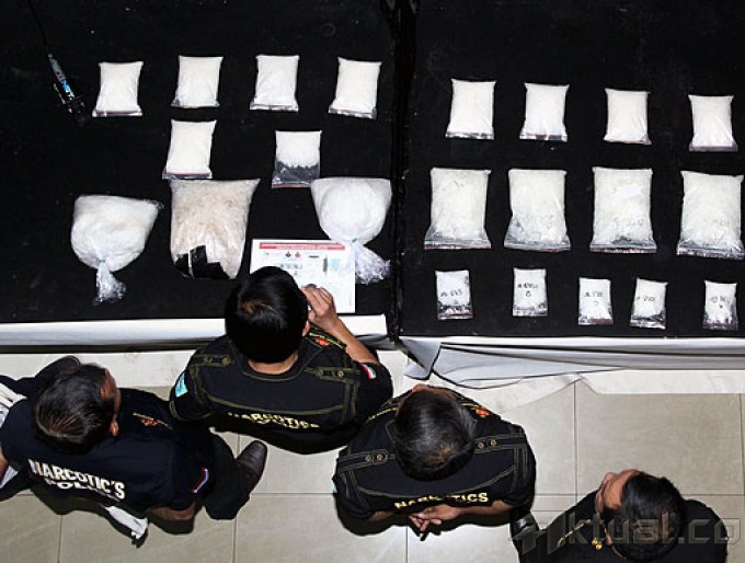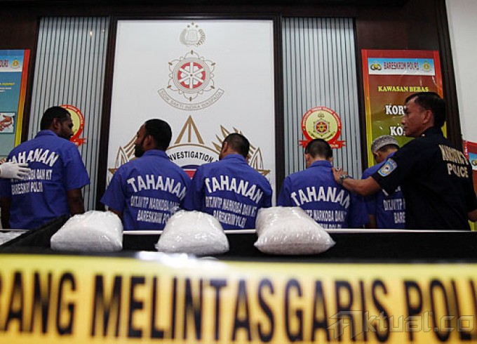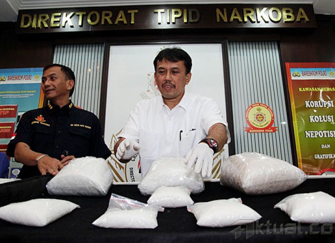 Direktorat Tindak Pidana narkoba Bareskrim Polri merilis penangkapan sindikat internasional narkotika jenis sabu yang dilakukan warga negara Sri Lanka, di Gedung Direktorat Tindak Pidana narkoba Bareskrim Polri, Cawang, Jakarta Timur, Selasa (21/04/2015). Polisi mengamankan lima tersangka, dua diantaranya warga negara Sri Lanka. Barang bukti yang disita polisi sebanyak 14,5 Kg sabu. AKTUAL/MUNZIR