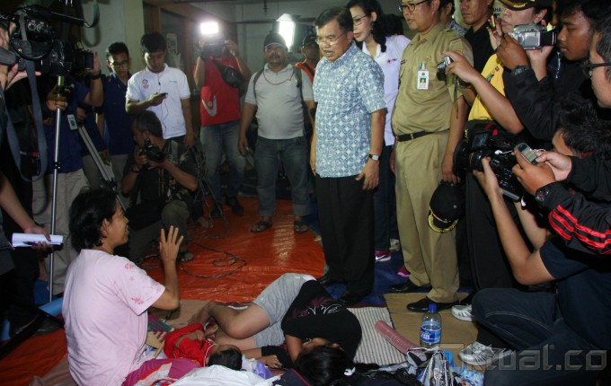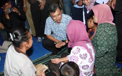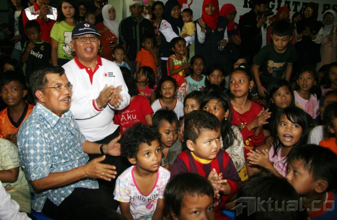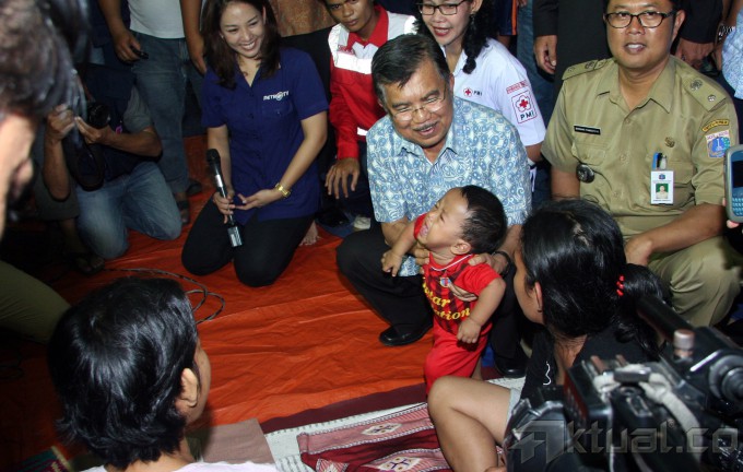 Ketua Palang Merah Indonesia (PMI) Jusuf Kalla berbincang dengan keluarga pengungsi banjir di lokasi pengungsian eks bioskop Nusantara, Jatinegara, Jakarta Timur, (14/1/2014). Jusuf Kalla menginstruksikan pasukannya agar tetap siaga apapun yang akan terjadi, juga mengutamakan kesiap-siagaan tehadap banjir agar dapat menolong masyarakat yang membutuhkan bantuan. Aktual/Tino Oktaviano