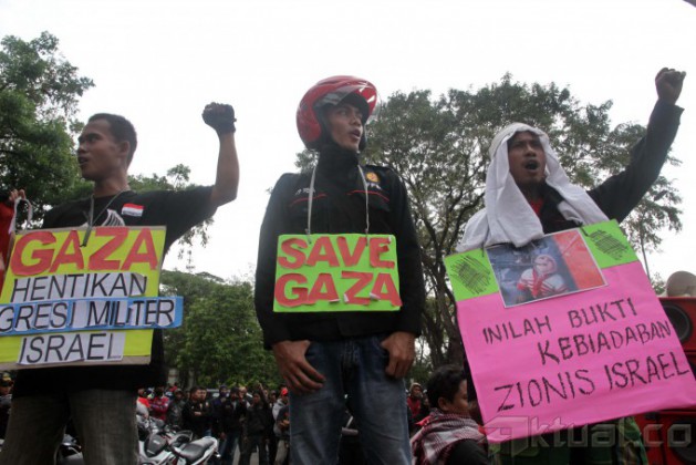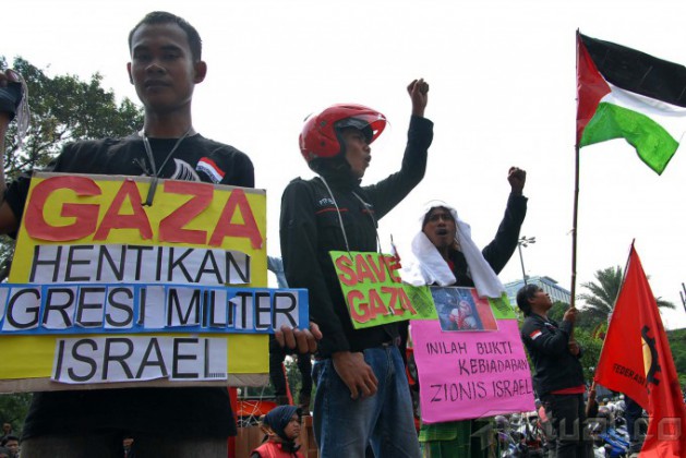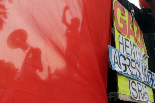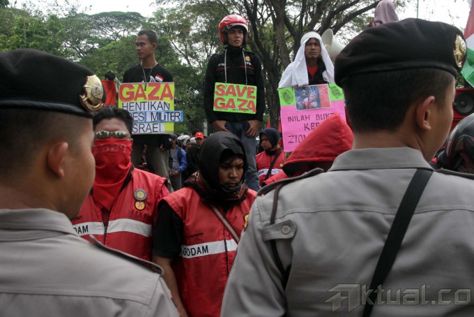 Massa Federasi Perjuangan Buruh Jabodetabek (FPBJ) berunjukrasa di depan Kedutaan Besar Amerika Serikat, di Jakarta, Rabu (16/7/2014). Selain meminta Amerika agar mendesak Israel menghentikan Invasi Militer ke Gaza yang menimbulkan banyak koban masyarakat sipil, mereka juga meminta agar Israel membuka semua jalur di perbatasan dan mencabut blokade agar bantuan kemanusian Internasional bisa masuk. Aktual/Tino Oktaviano