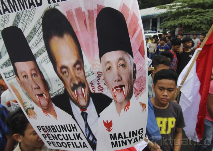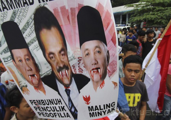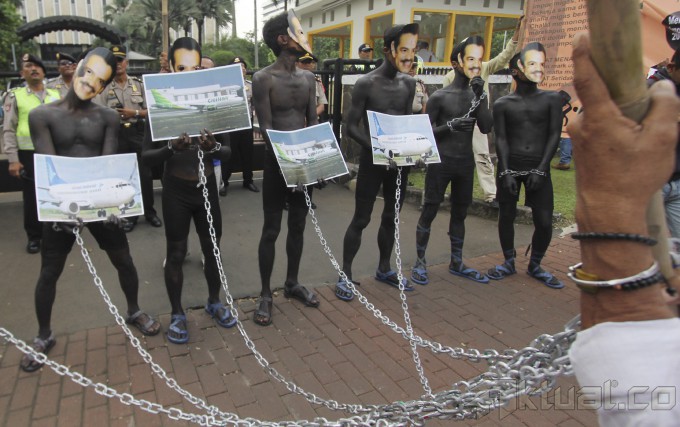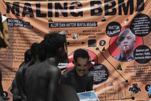 Pengunjuk rasa yang mengatasnamakan Zatapi SP3 saat menggelar aksi demo di depan kantor Kemenko Perekonomian di Lapangan Banteng, Jakarta, Kamis (3/7/2014). Aksi yang digelar oleh demonstran Zatapi SP3 ini untuk mengkritisi penyelesaian tuntas mafia impor BBM. aktual/Tino Oktaviano
