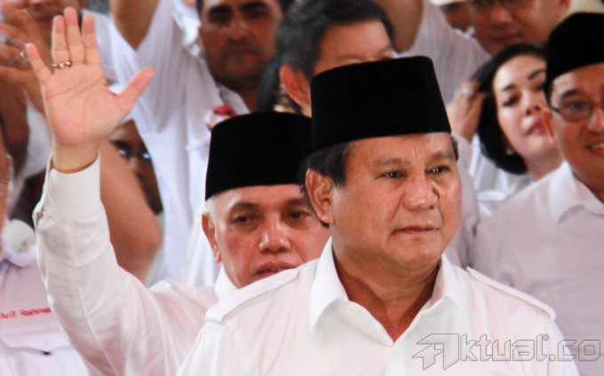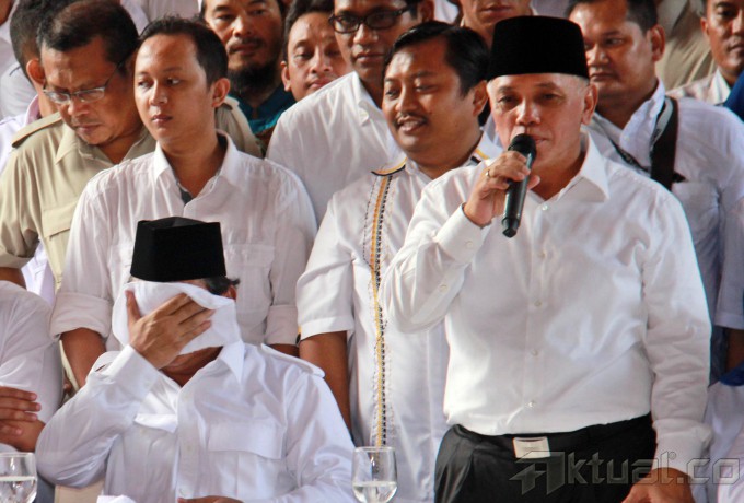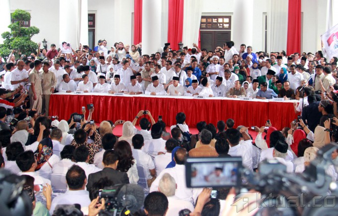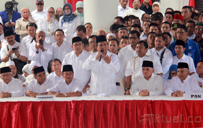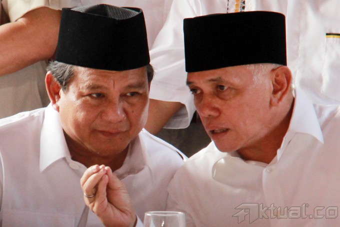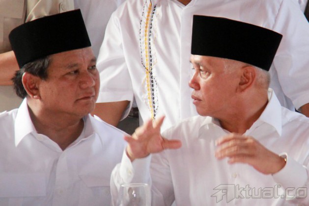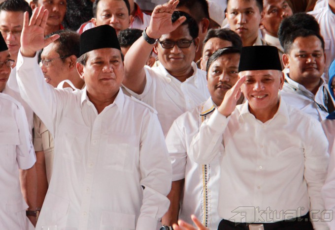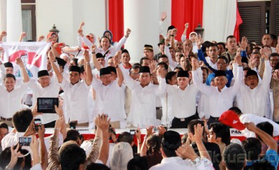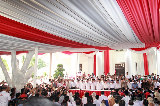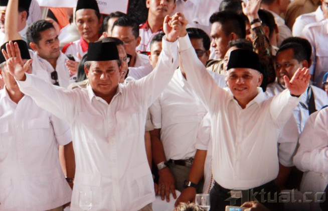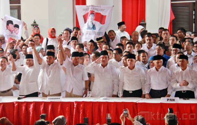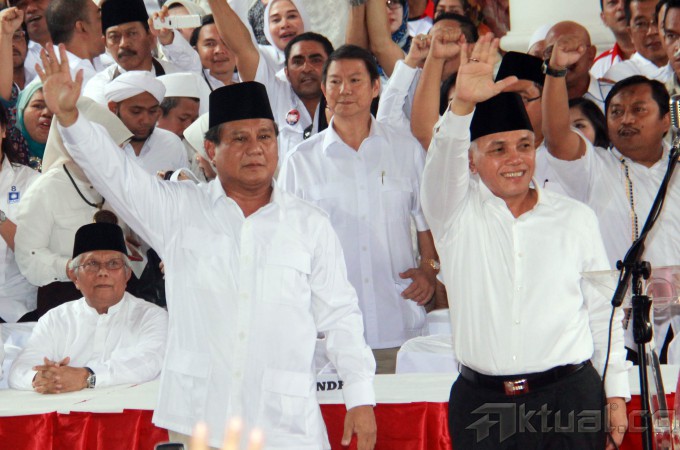 Capres Partai Gerindra Prabowo Subianto bersama Cawapres Partai Amanat Nasional (PAN) Hatta Rajasa, mengangkat tangan bersama saat Deklarasi di Rumah Polonia, Cipinang, Jakarta Timur, Senin (19/5/2014). Prabowo Subianto dan Hatta Rajasa mendeklarasikan diri sebagai Capres dan Cawapres di Rumah Polonia, karena dinilai memiliki nilai sejarah yang besar. Rumah itu pernah ditempati Presiden pertama Indonesia Sukarno. Pemilihan Hatta sebagai Cawapres Prabowo diputuskan dalam rapat koordinasi dengan Partai koalisi yaitu Gerindra, Partai Amanat Nasional, Partai Persatuan Pembangunan, dan Partai Keadilan Sejahtera. Juga di akhir Deklarasi, Partai Golkar menyusul bergabung mendukung Prabowo – Hatta. Aktual/Tino Oktaviano