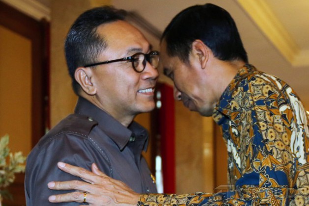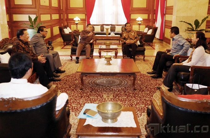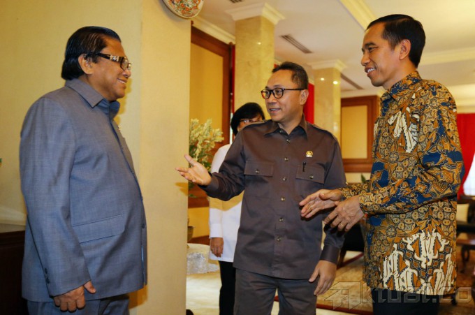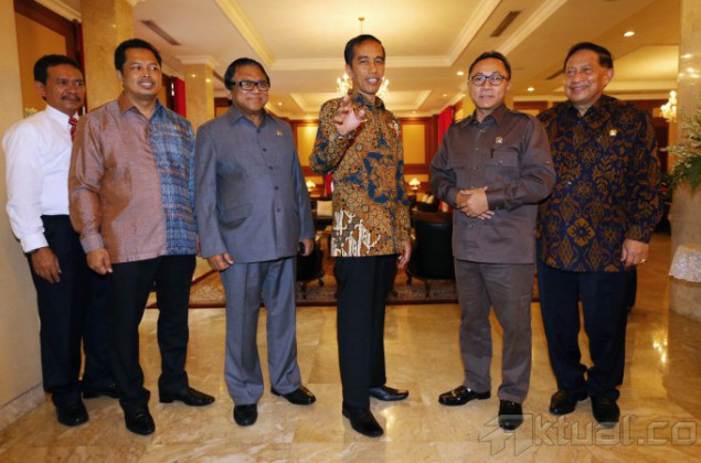 Presiden terpilih, Joko Widodo (ketiga kanan), menerima Ketua MPR terpilih, Zulkifli Hasan (kedua kanan), didampingi wakilnya Mahyudin, EE Mangindaan dan Oesman Sapta, di rumah dinas Gubernur DKI Jakarta, Senin (13/10/2014). Pertemuan ini membahas mekanisme pembacaan sumpah presiden dan wakil presiden 20 Oktober mendatang. AKTUAL/TINO OKTAVIANO
