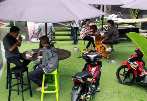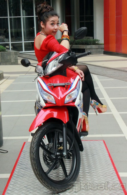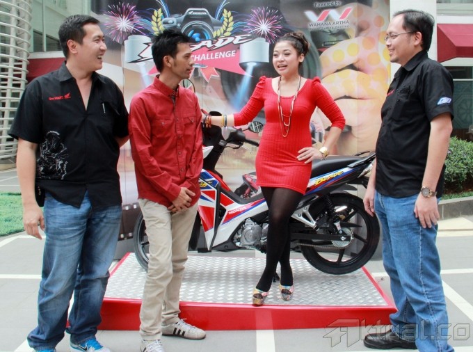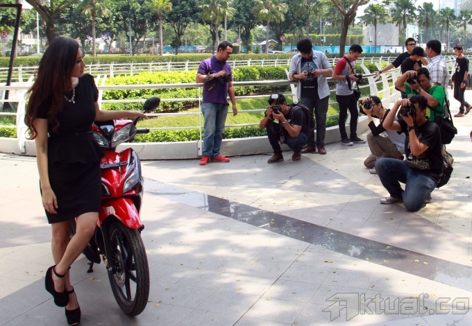 Seorang model berpose diatas sepeda motor Honda Blade acara kompetisi fotografi bertajuk “Blade Photo Challenge” di Epicentrum Walk, Kuningan, Jakarta, Sabtu (26/10/2013). PT Wahana Makmur Sejati (WMS) sebagai main dealer sepeda motor Honda di DKI Jakarta dan Tangerang menggelar kompetisi fotografi ditujukan bagi wartawan, umum. Kontes foto berlangsung 26 Oktober hingga 6 Desember 2013 yang memperebutkan hadiah utama 3 unit Honda Blade di setiap kategori. Aktual/Tino Oktaviano