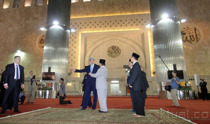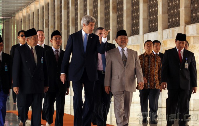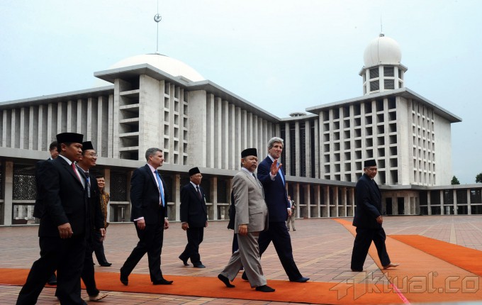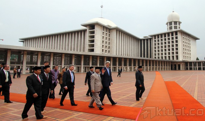 Menlu AS John Kerry (melambai) saat mengunjungi Masjid Istiqlal, ditemani Imam Besar masjid itu, KH Ali Mustafa Yakub (ke tiga kiri), di Jakarta, Minggu (16/2/2014). Bersamaan dengan tur Asia yang dilakukan Menteri Luar Negeri Amerika Serikat, Indonesia menekankan urgensi ditandatanganinya sebuah perjanjian yang mencegah meluasnya pelanggaran wilayah di kawasan Asia Tenggara. Aktual/Tino Oktaviano