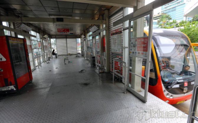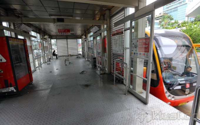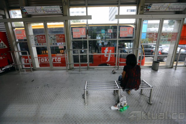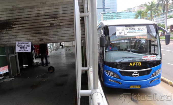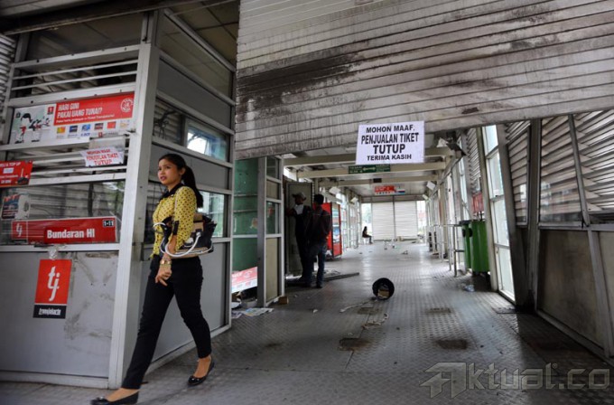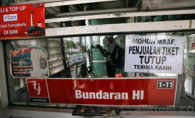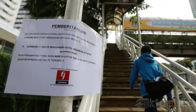 Papan pengumuman pemberitahuan halte tutup dan tidak beroperasi terpasang di Halte Bus TransJakarta Bundaran Hotel Indonesia, Jakarta Pusat, Senin (7/1/2014). Penutupan halte itu terkait akan dibangunnya proyek Mass Rapid Transit (MRT) di tempat tersebut. Aktual/Tino Oktaviano
