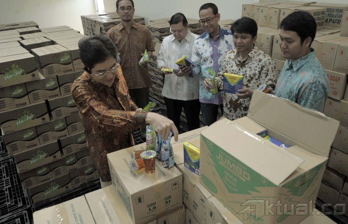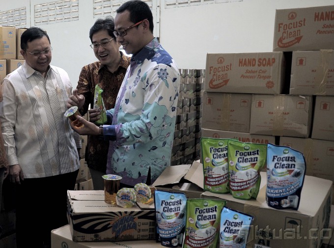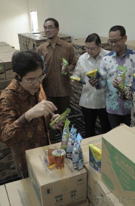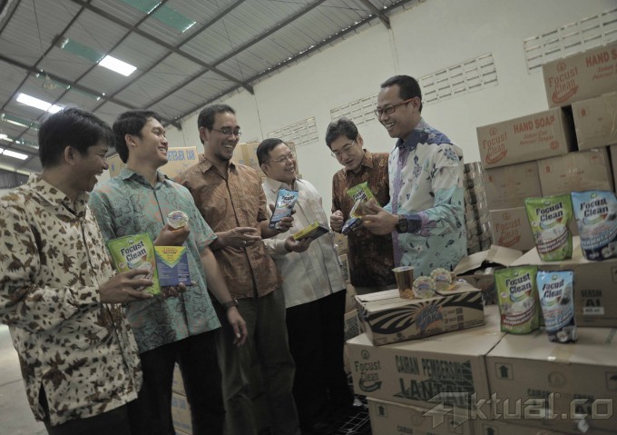 Djafar lingkaran komisaris utama DAJK Tbk(kiri), PT Dwi Aneka Jaya Kemasindo TBK Andreas chaiyadi (dua kanan belakang), Chairman PT Putra Perkasa Distrindo Witjaksono (kanan), beserta jajaran direksi PT Pandawa Putra Perkasa saat Launching dan Pembukaan gudang baru PT Putra Perkasa Distrindo di Cilangkap, Jakarta Timur, Jumat (9/5/2014). Sebagai member dari PT Pandawa Putra, Witjaksono menargetkan bisa meraih pangsa pasar lebih dari 30% dalam bisnis distribusi dan pergudangan di Indonesia untuk tahun ini. Aktual/Tino Oktaviano
