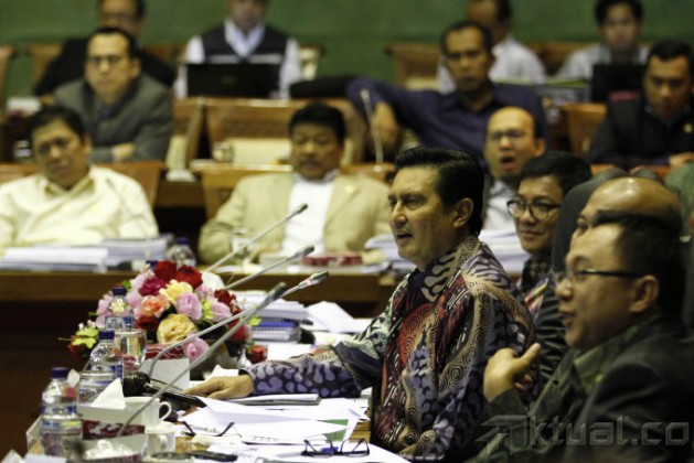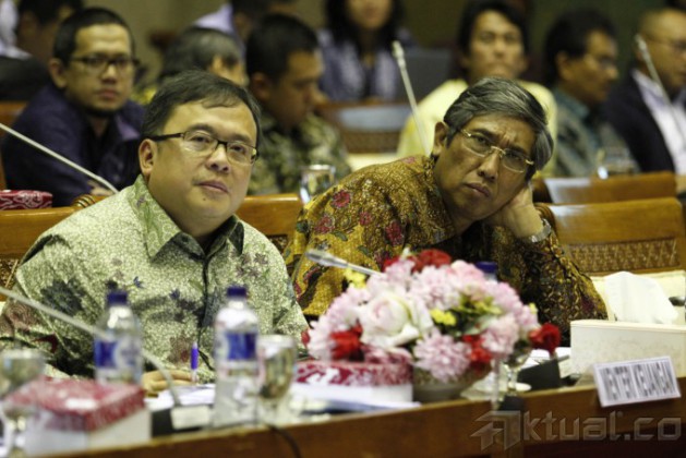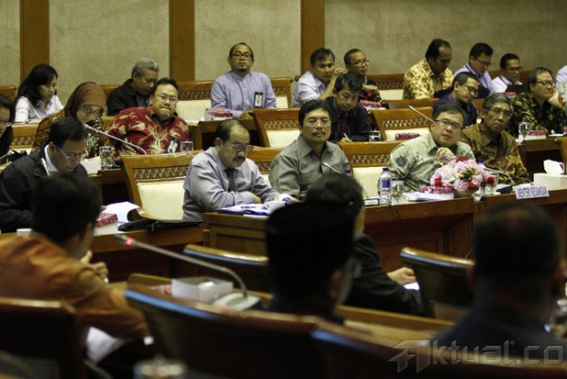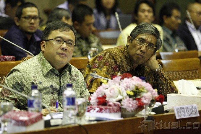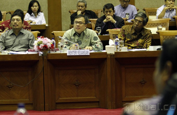 Menteri Keuangan Bambang Brodjonegoro, Wakil Menteri Keuangan Mardiasmo, Direktur Jenderal Pengelolaan Utang Robert Pakpahan, Direktur Jenderal Kekayaan Negara Hadiyanto dan Sekretaris Jenderal Kemenkeu Kiagus Badaruddin mengadiri rapat kerja dengan Komisi XI DPR RI di Komplek Parlemen Senayan, Jakarta, Kamis (5/2/2015). Agenda rapat tersebut membahas rencana mengenai Penyertaan Modal Negara (PMN) yang diusulkan Rp 48,01 triliun. PMN untuk BUMN telah ditetapkan menjadi Rp39,9 triliun di panitia kerja Badan Anggaran DPR melalui Rapat Kerja. AKTUAL/JUNAIDI MAHBUB