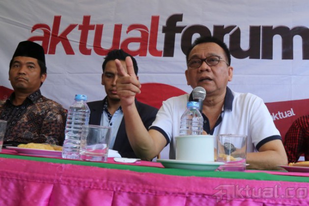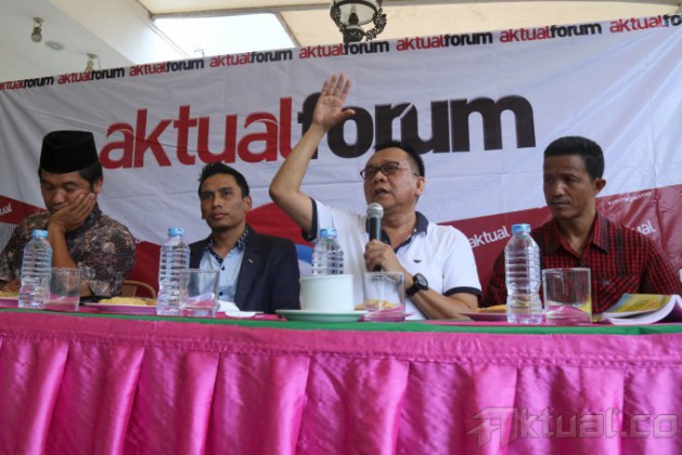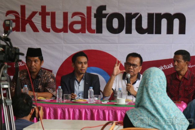 Wakil Ketua DPRD DKI Jakarta Mhammad Taufik (kedua kanan), bersama Pengamat Politik Ray Rangkuti (kiri), Pakar Hukum Tata Negara Masnur Marzuki (kedua kiri) dan Pengamat Parlemen Lucius Karus (kanan) saat menjadi pembicara diskusi Aktual Forum di Warung Komando, Tebet, Jakarta Selatan, Minggu (3/5/2015). Muhammad Taufik meluruskan, bahwa maksud dari Hak Menyampaikan Pendapat (HMP) atau Hasil Angket terhadap Gubernur DKI Jakarta, Basuki Tjahaja Purnama (Ahok) tidak selalu bertujuan untuk ‘pemakzulan’. Pasalnya, HMP juga bisa jadi berujung pada peringatan saja. AKTUAL/TINO OKTAVIANO