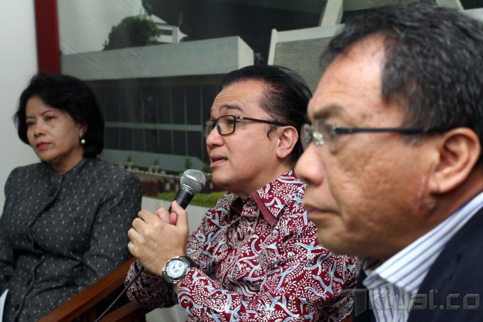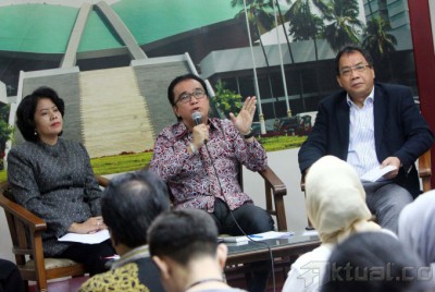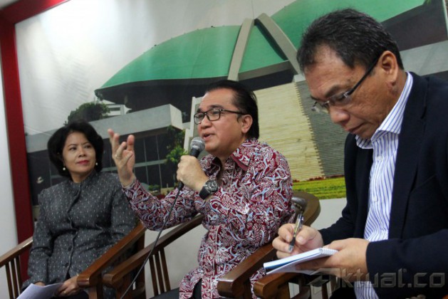 Wakil Ketua Komisi I DPR Tantowi Yahya (tengah) bersama Direktur Utama LPP RRI Niken Widiastuti (kiri) dan Direktur Teknik/Plt.Direktur Program dan Berita LPP TVRI Syafrullah (kanan) berbicara dalam diskusi Forum Legislasi, di Gedung Parlemen, Jakarta, Selasa (15/7/2014). Diskusi ini membahas Rancangan Undang-undang Radio Televisi Republik Indonesia (RUU-RTRI) yang masih dalam tahap penyelesaian, untuk mengganti UU Penyiaran dan PP No.12 dan PP No.13 tahun 2005, dimana nantinya RUU didiharapakan dapat mengatasi permasalahan yang selama ini mengganggu akselerasi kedua LPP ini dan dapat menjadi lembaga yang melahirkan program-pogram kreatif yang bersaing dengan lembaga-lembaga penyiaran swasta. Aktual/Tino Oktaviano