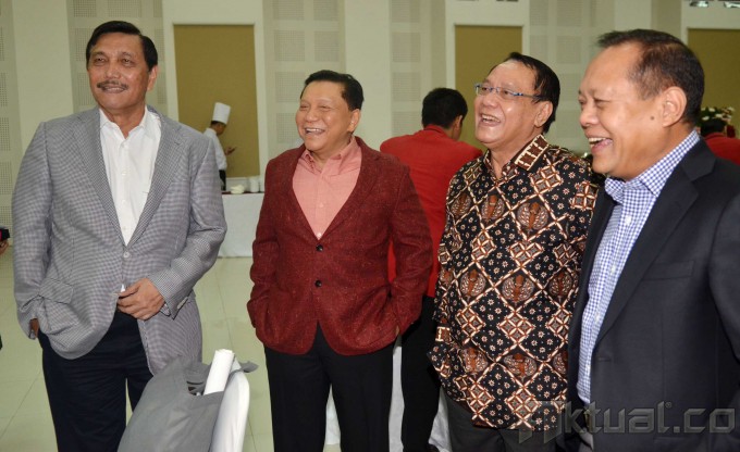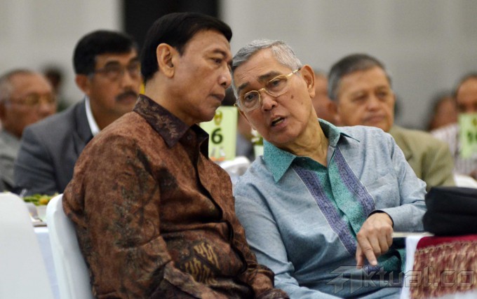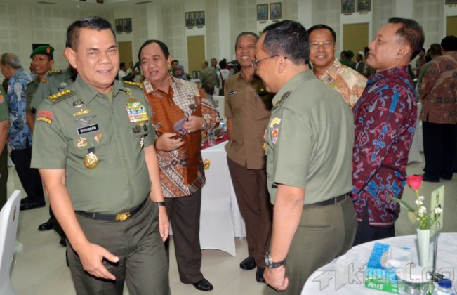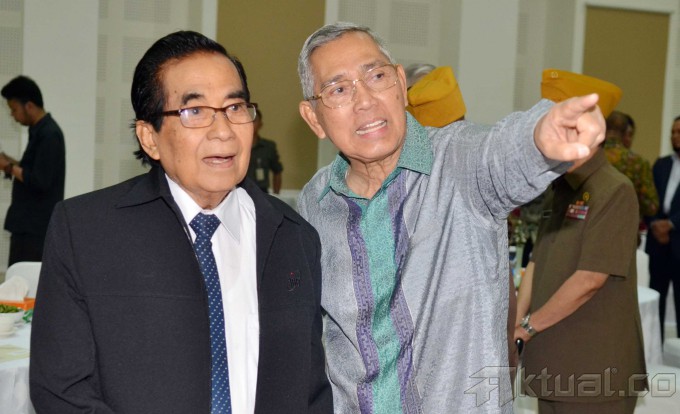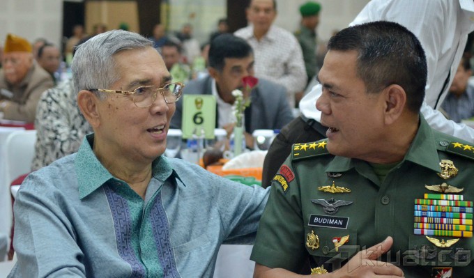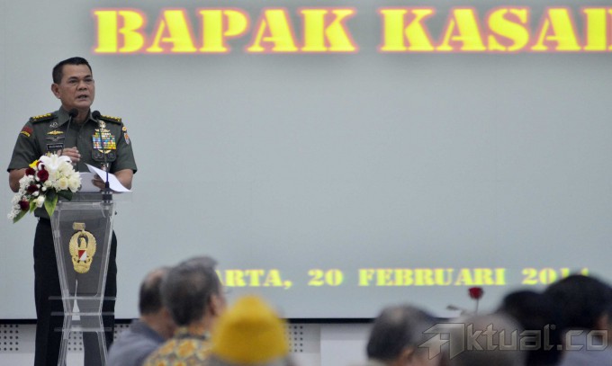 Dari kiri ke kanan, Jenderal TNI (Purn) Wiranto, Jenderal TNI (Purn) Try Sutrisno, Jenderal TNI (Purn) Pramono Edhie Wibowo, Kasad Jenderal TNI Budiman dan Jenderal TNI (HOR) Soerjadi Soedirdja menghadiri forum silaturahmi Kasad dengan Perwira Tinggi Purnawirawan TNI AD dalam rangka komitmen netralitas TNI menghadapi Pemilu 2014 di Mabesad, Jakarta Pusat, Kamis (20/2). Aktual/Tino Oktaviano