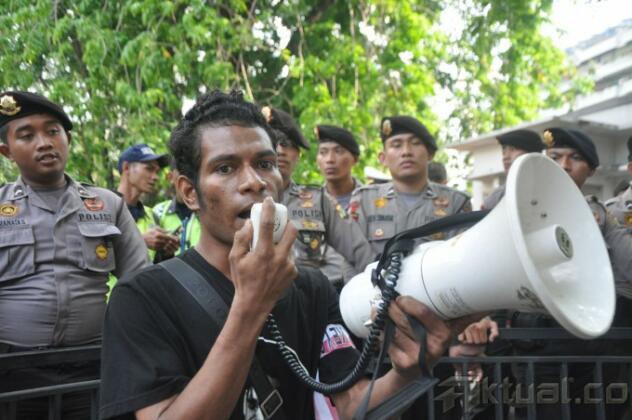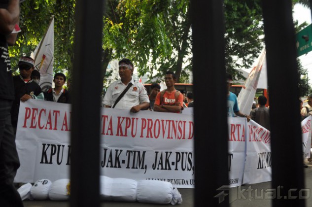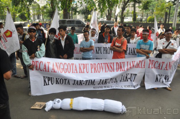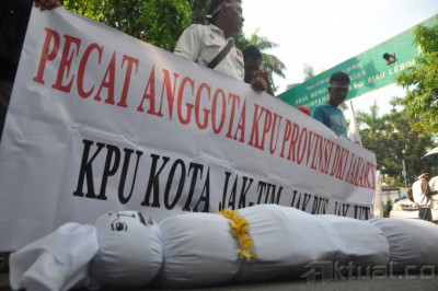 Sejumlah massa melakukan aksi unjuk rasa saat persidangan Dewan Kehormatan Penyelenggara Pemilu (DKPP), di Depan Gedung Kemenag, Jakarta, Jumat (8/8/2014). dalam aksinya mereka mereka membawa boneka pocong dan meminta DKPP memecat anggota KPU. Aktual/Junaidi Mahbub