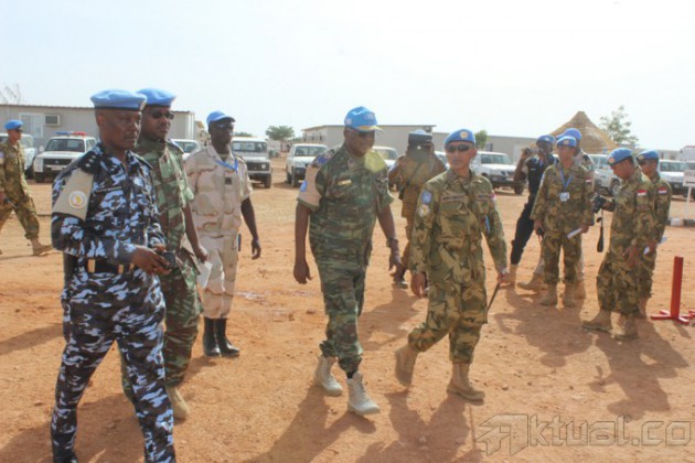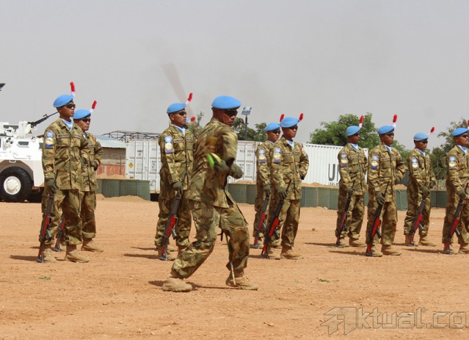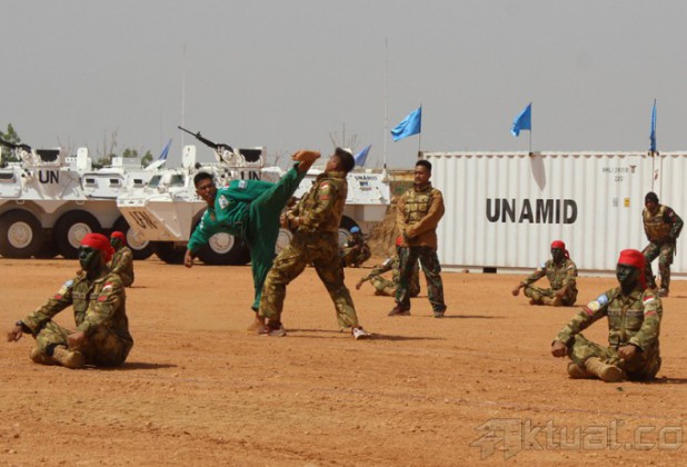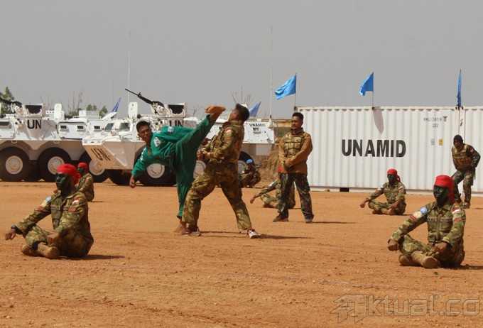Prajurit TNI yang tergabung dalam Satgas Batalyon Komposit TNI Kontingen Garuda (Konga) XXXV-A/Unamid (United Nations Mission In Darfur) atau Indonesian Battalion (Indobatt), menggelar demonstrasi pada upacara peringatan United Nation Peacekeepers Day yang dilaksanakan di Lapangan Hasanudin, Garuda Camp, Markas Indobatt, Sektor Barat, Darfur-Afrika, Jumat (29/5/2015). AKTUAL/PUSPEN TNI