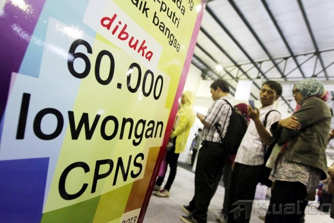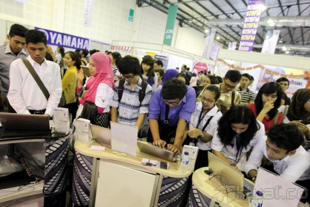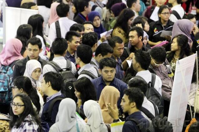 Sejumlah pencari kerja antre untuk mendapatkan formulir saat digelar bursa kerja di Balai Kartini, Jakarta Selatan, Jumat (30/8). Bursa kerja tersebut digelar untuk memberikan kesempatan pemuda pemudi yang baru lulus sekolah maupun kuliah untuk mendapatkan pekerjaan serta bertujuan untuk mengurangi pengangguran di Indonesia. Aktual/Tino Oktaviano
