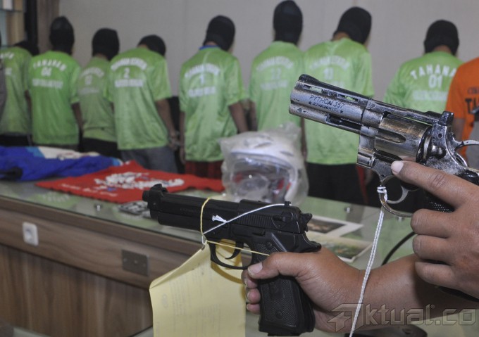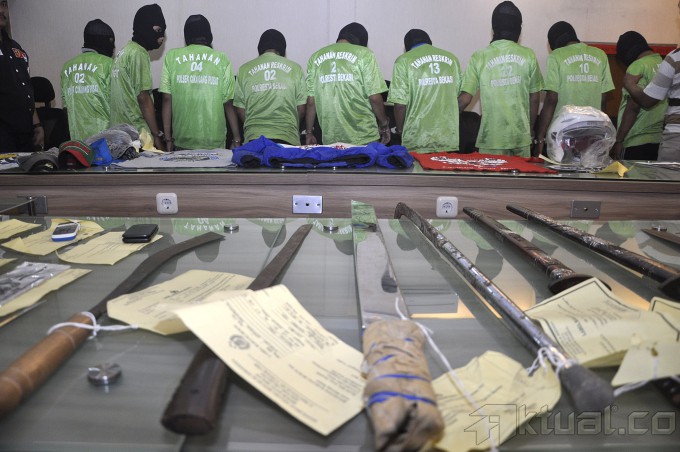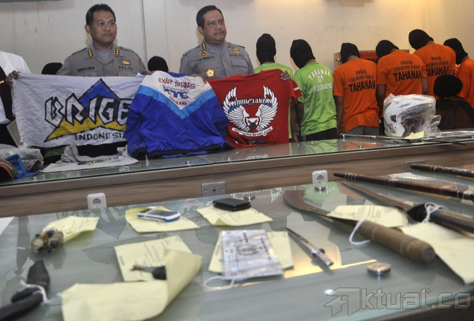 Tersangka anggota geng motor digelandang petugas kepolisian saat dihadirkan dalam rilis awak media di Mapolda Metro Jaya, Jakarta, Senin (29/9/2014). 17 Tersangka yang merupakan anggota dari geng motor Brigez (5 orang), Moonracer (6 orang), dan XTC (6 orang) ini diamankan dari wilayah Bekasi. AKTUAL/TINO OKTAVIANO