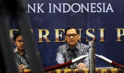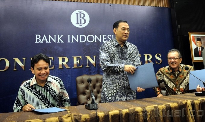 Gubenur Bank Indonesia Agus Martowardojo (kanan) didampingi Deputi Gubernur Senior BI Mirza Adityaswara (kiri) memberikan keterangan pers saat mengelar jumpa pers terkait hasil rapat Dewan Gubernur di Jakarta, Selasa (8/10/2013). Hasil rapat Bank Indonesia (BI) hari ini menetapkan, suku bunga acuan pada Oktober tak berubah atau bertahan di level 7,25%. Pada bulan lalu dan BI mengumumkan kebijakan ekstrem dengan menaikkan suku bunga acuan dari sebelumnya 7% pada Agustus 2013 menjadi 7,25% pada September 2013. Aktual/Tino Oktaviano