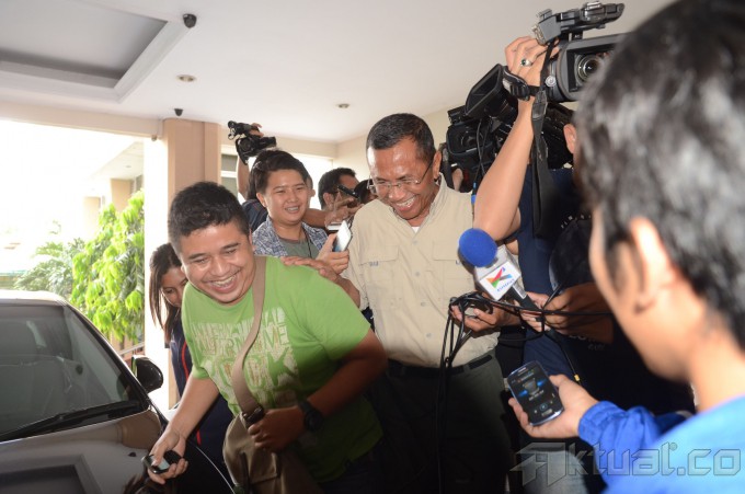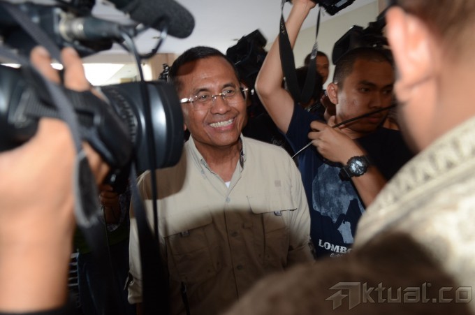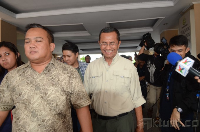 Mantan Dirut PT PLN (Persero) Dahlan Iskan dikerubutin wartawan usai diperiksa di Gedung Kejaksaan Tinggi DKI Jakarta, Jumat (5/6/2015). Dahlan ditetapkan sebagai tersangka terkait kasus dugaan korupsi proyek pengadaan dan pembangunan gardu induk di Unit Induk Pembangkit dan Jaringan Jawa, Bali dan Nusa Tenggara, milik PLN tahun anggaran 2011-2013. AKTUAL/TINO OKTAVIANO
