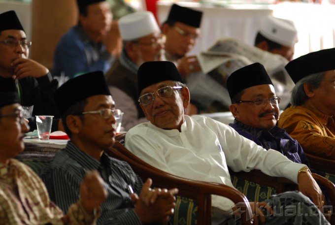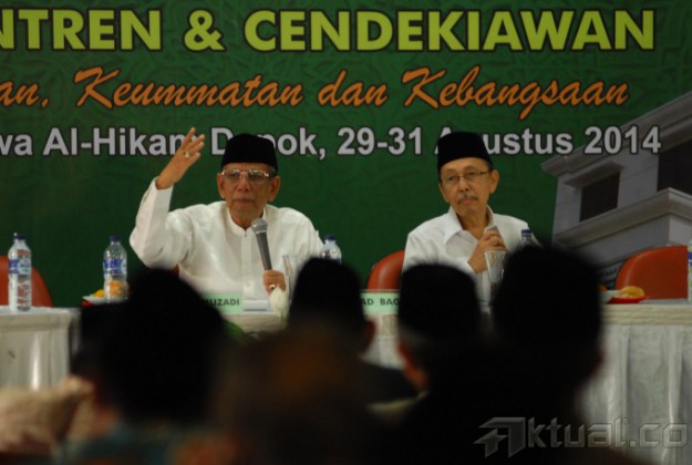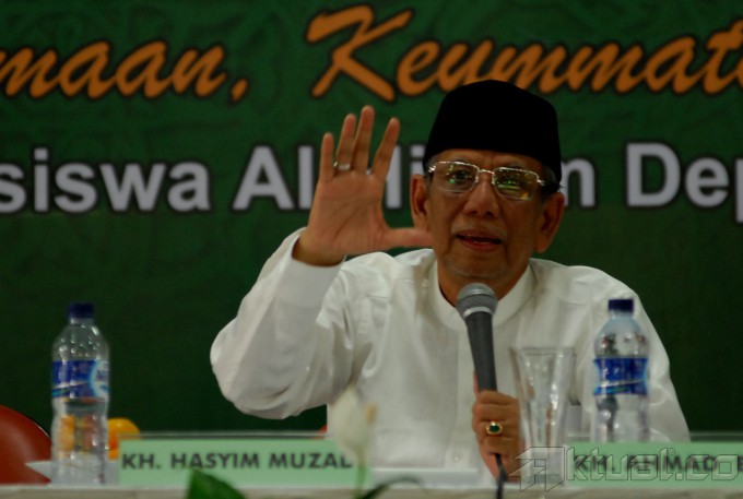 Pengasuh Pondok Pesantren Al Hikam, KH Hasyim Muzadi memberikan sambutan pada acara pembukaan saresehan pra munas dan kombes di Pesantren Al Hikam, Beji, Depok, Sabtu (30/8/2014). Acara tersebut dihadiri ratusan ulama se Nusantara.Aktual/Tino Oktaviano