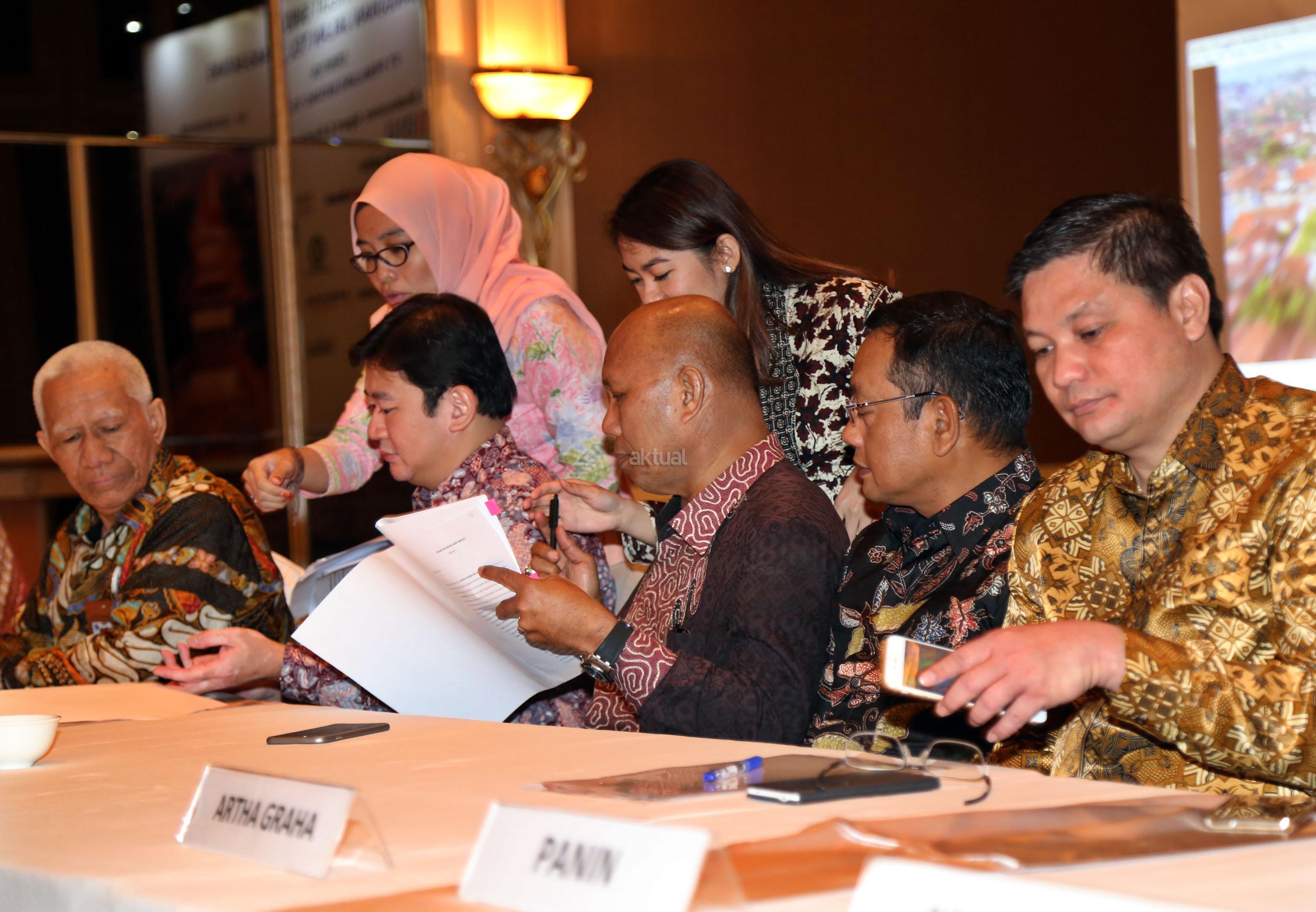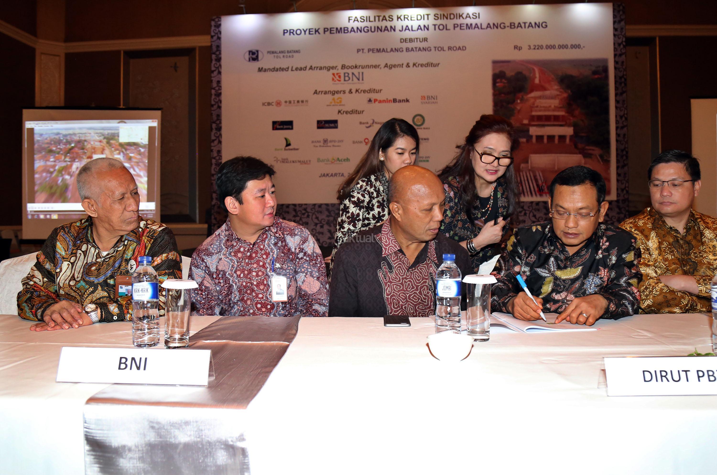 Dari kiri ke kanan, Wakil Pemimpin Divisi BIN BNI Benny Yaslim, Kepala Badan Pengatur Jalan Tol Bambang Eko Hargianto, Direktur Bisnis Menengah BNI Putrama Wahju Setyawan, Dirut PT Sumber Mitra Jaya Gowindasamy, Dirut PT Waskita Tol Road Herwidiakto dan Dirut PT Pemalang – Batang Tol Road Supriyono berbincang usai penandatanganan kerjasama fasilitas kredit sindikasi proyek pembangunan jalan tol Pemalang-Batang di Jakarta, Rabu (24/5). PT Bank Negara Indonesia Tbk (BNI) memimpin kredit sindikasi proyek pembangunan jalan Tol Pemalang-Batang. Kontribusi pembiayaan bank dalam proyek ini sebesar Rp 3,22 triliun dari total kebutuhan dana Rp 4,88 triliun. AKTUAL/Tino Oktaviano