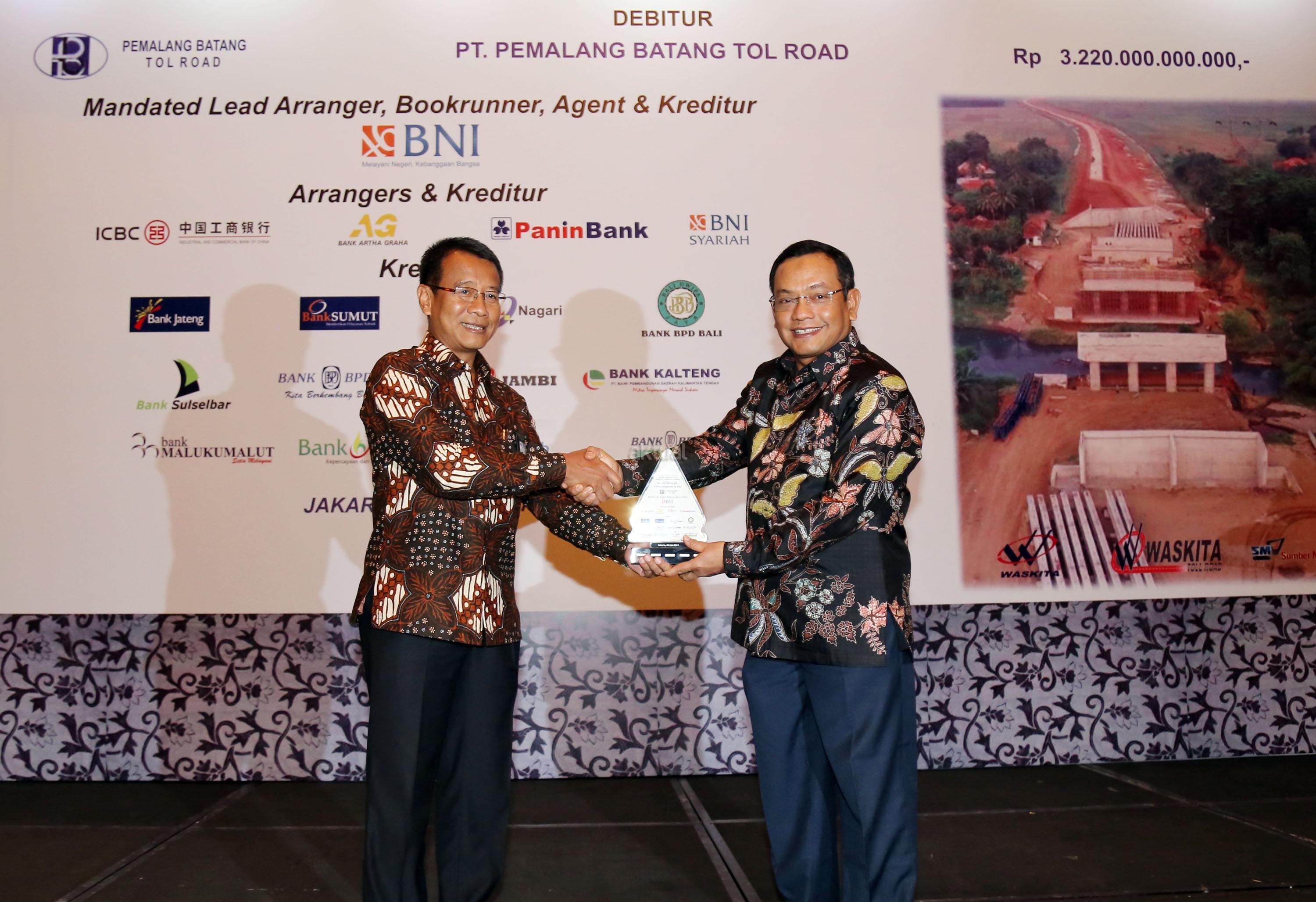 Direktur Bisnis Menengah BNI Putrama Wahju Setyawan memberikan cinderamata kepada Dirut PT Pemalang – Batang Tol Road Supriyono usai penandatanganan kerjasama fasilitas kredit sindikasi proyek pembangunan jalan tol Pemalang-Batang di Jakarta, Rabu (24/5). PT Bank Negara Indonesia Tbk (BNI) memimpin kredit sindikasi proyek pembangunan jalan Tol Pemalang-Batang. Kontribusi pembiayaan bank dalam proyek ini sebesar Rp 3,22 triliun dari total kebutuhan dana Rp 4,88 triliun. AKTUAL/Tino Oktaviano