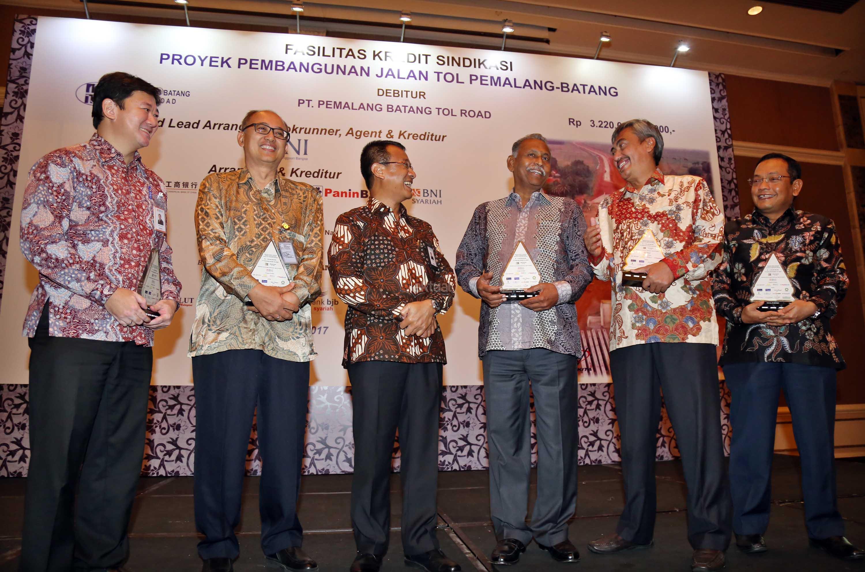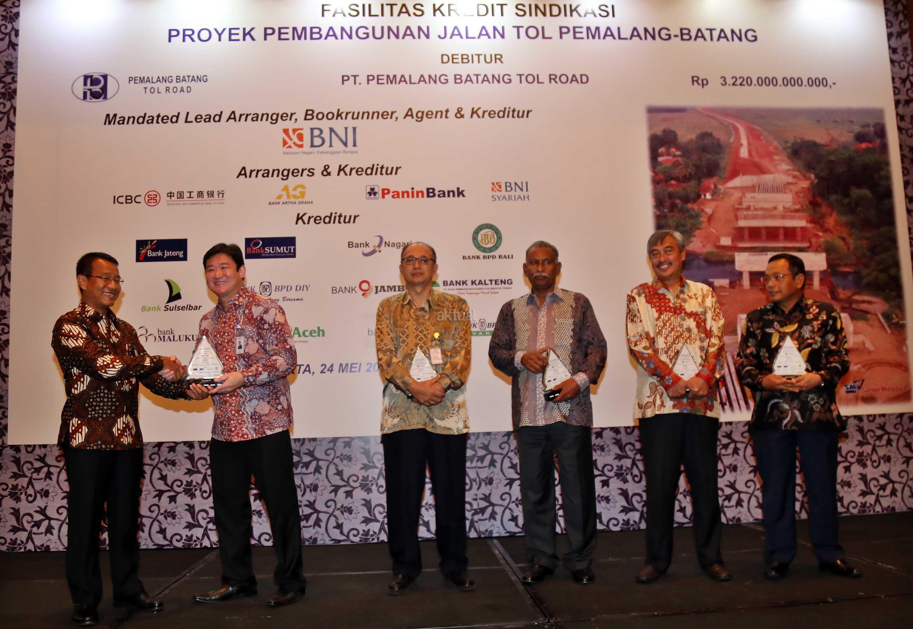 Direktur Bisnis Menengah BNI Putrama Wahju Setyawan memberikan cinderamata kepada Wakil Pemimpin Divisi BIN BNI Benny Yaslim disaksikan Dirut PT Pemalang – Batang Tol Road Supriyono, Dirut PT Waskita Tol Road Herwidiakto, Dirut PT Sumber Mitra Jaya Gowindasamy dan Kepala Badan Pengatur Jalan Tol Bambang Eko Hargianto usai penandatanganan kerjasama fasilitas kredit sindikasi proyek pembangunan jalan tol Pemalang-Batang di Jakarta, Rabu (24/5). PT Bank Negara Indonesia Tbk (BNI) memimpin kredit sindikasi proyek pembangunan jalan Tol Pemalang-Batang. Kontribusi pembiayaan bank dalam proyek ini sebesar Rp 3,22 triliun dari total kebutuhan dana Rp 4,88 triliun. AKTUAL/Tino Oktaviano