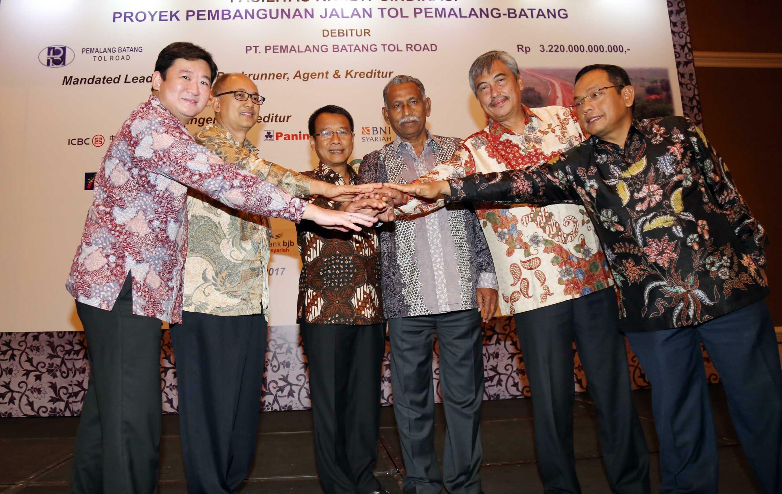 Dari kiri ke kanan, Wakil Pemimpin Divisi BIN BNI Benny Yaslim, Kepala Badan Pengatur Jalan Tol Bambang Eko Hargianto, Direktur Bisnis Menengah BNI Putrama Wahju Setyawan, Dirut PT Sumber Mitra Jaya Gowindasamy, Dirut PT Waskita Tol Road Herwidiakto dan Dirut PT Pemalang – Batang Tol Road Supriyono bertumpu tangan usai penandatanganan kerjasama fasilitas kredit sindikasi proyek pembangunan jalan tol Pemalang-Batang di Jakarta, Rabu (24/5). PT Bank Negara Indonesia Tbk (BNI) memimpin kredit sindikasi proyek pembangunan jalan Tol Pemalang-Batang. Kontribusi pembiayaan bank dalam proyek ini sebesar Rp 3,22 triliun dari total kebutuhan dana Rp 4,88 triliun. AKTUAL/Tino Oktaviano