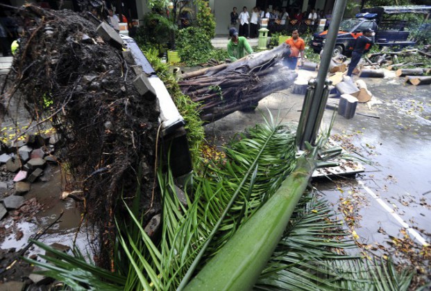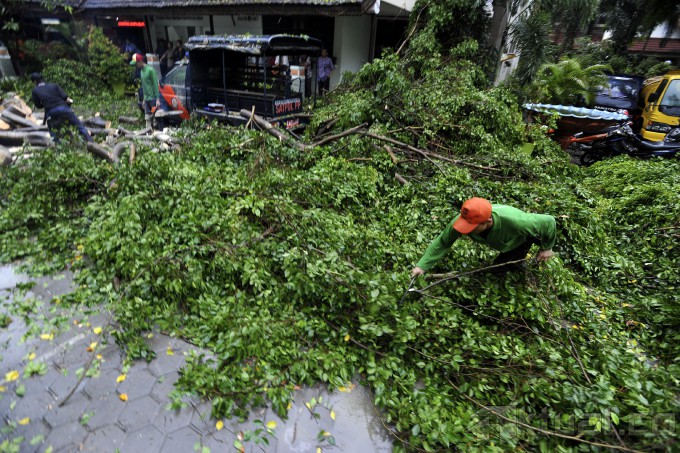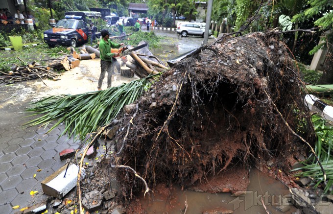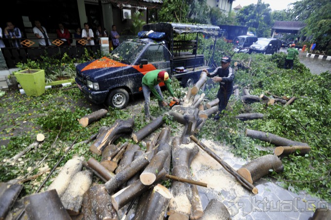 Pekerja membersihkan sisa dahan dari sebuah pohon besar yang roboh dan menimpa mobol opreasional Satpol PP di halaman kantor Kecamatan Setiabudi, Jakarta (28/11/2014). Hujan deras disertai angin kencang menyebabkan pohon tumbang di sejumlah kawasan di ibukota. AKTUAL/TINO OKTAVIANO