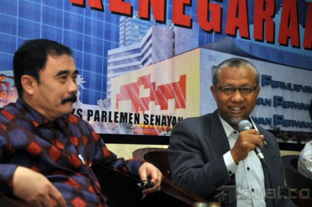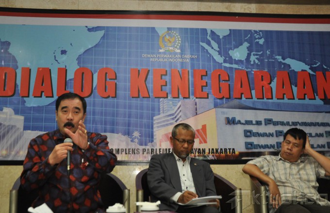 Dari kiri ke kanan, Dirjen Keuangan Daerah Kemendagri Reydonnyzar Moenek MDevt M, Ketua Komite IV DPD RI Cholid Mahmut MT dan Direktur Ekesekutif Centre for Budget Analysis (CBA) Uchok Sky Khadafi saat menjadi narasumber pada Dialog Kenegaraan yang bertema “APBD Pro Siapa? (Kasus Penyusunan dan Pembahasan RAPBD DKI Jakarta) di Cofe Corner DPD, Kompleks Parlemen Senayan, Jakarta Selatan, Rabu (25/3/2015). Kisruh APBD 2015 antara DPRD dan Ahok diprediksi tidak akan menemukan jalan damai. Sebab, antara kedua pihak tidak ada lagi saling percaya. AKTUAL/JUNAIDI MAHBUB