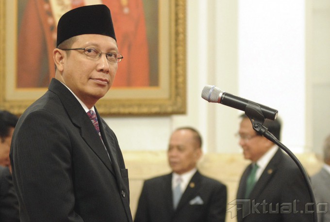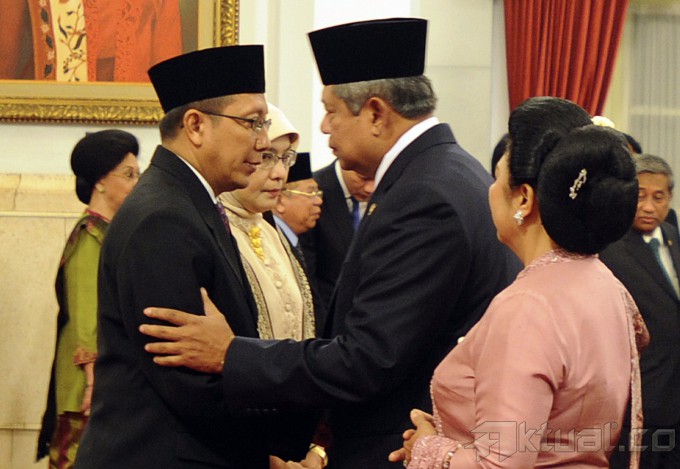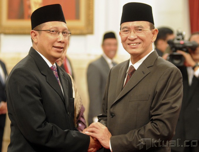 Menteri Agama Lukman Hakim Saifuddin (kiri) bersalaman dengan pejabat yang digantikan Suryadharma Ali seusai pelantikan yang dipimpin Presiden Susilo Bambang Yudhoyono di Istana Negara, Jakarta, Senin (9/6/2014). Suryadharma Ali mengundurkan diri sebagai Menteri Agama setelah dirinya ditetapkan sebagai tersangka kasus korupsi dana haji oleh KPK. Aktual/Ist