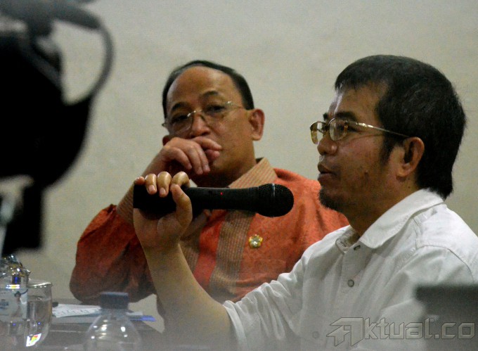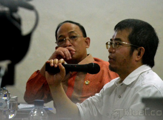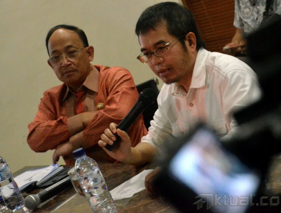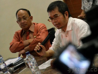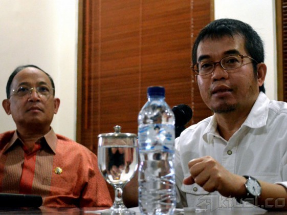 Gubernur Lemhanas, Budi Soesilo Soepandji bersama Pengamat Politik Yudi Latief saat Journalist Meeting Kebangsaan di Jakarta, Senin (16/3/2015). Acara yang digelar oleh Founding Fathers House bertema ‘Menanti Kehancuran Negara Republik Indonesia? AKTUAL/MUNZIR
