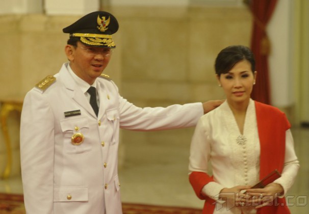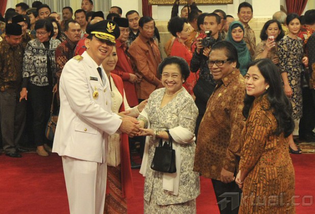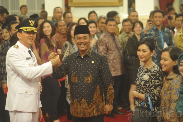 Presiden Joko Widodo bersama Gubernur DKI Jakarta, Basuki Tjahaya Purnama (Ahok) bersalaman usai pelantikan di Istana Negara, Rabu (19/11/2014). Basuki Tjahaja Purnama menjadi gubernur pertama yang dilantik langsung oleh Presiden Joko Widodo sesuai Pasal 163 ayat 1 Peraturan Pemerintah Pengganti Undang-Undang (Perpu) tentang pemilihan kepala daerah. AKTUAL/STR