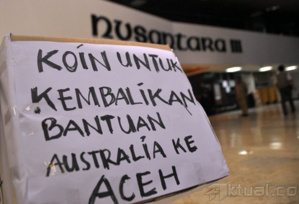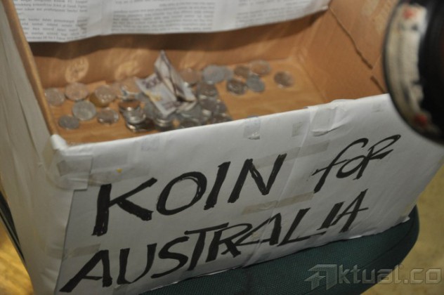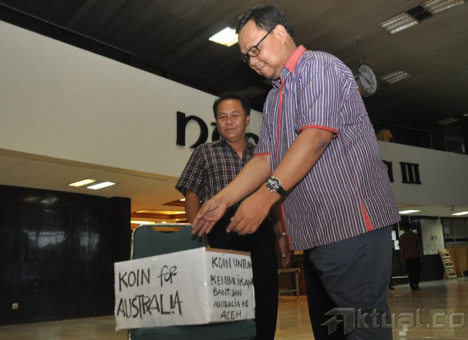 Wakil Komisi II DPR RI, M Lukman Edi, memasukan koin ke kotak kerdus bertuliskan Koin For Australia di depan Loby Nusantara III, DPR, Senayan, Jakarta, Senin (23/2/2015). Pemberian koin tersebut sebagai ungkapan kekecewaan terhadap pernyataan PM Australia, Tonny Abbott tentang bantuan tsunami Aceh tidak etis. AKTUAL/JUNAIDI MAHBUB