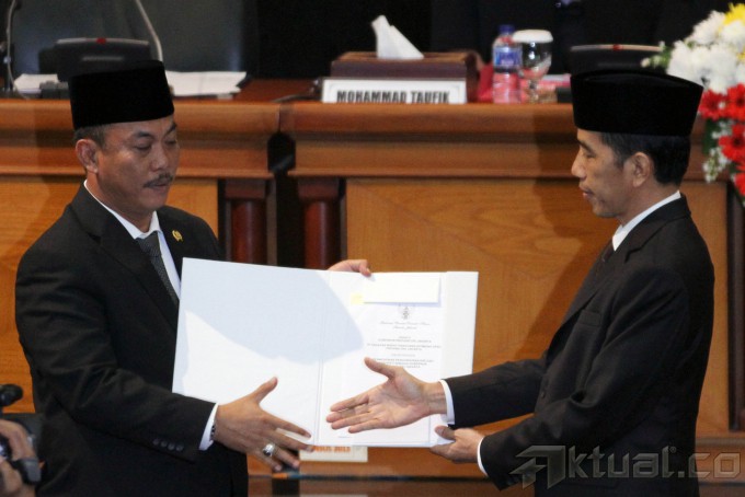 Presiden terpilih Joko Widodo (kanan) menyerahkan surat pengunduran diri sebagai Gubernur DKI Jakarta periode 2012-2017 kepada Ketua Dewan Perwakilan Rakyat Daerah (DPRD) DKI Prasetyo Edi Marsudi sidang paripurna di Gedung DPRD, Jakarta, Kamis (2/10/2014). Jokowi rencananya akan dilantik menjadi Presiden RI ke-7 pada 20 Oktober mendatang. AKTUAL/TINO OKTAVIANO