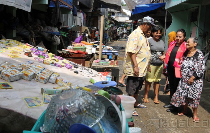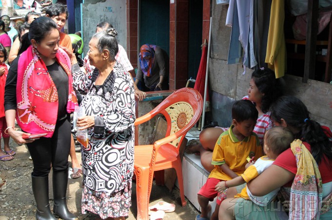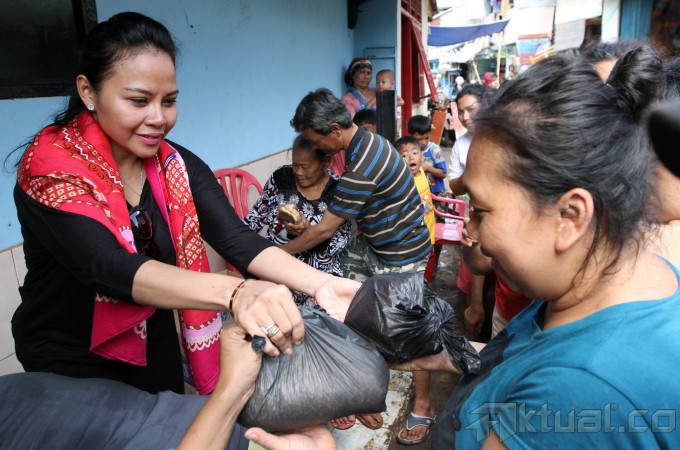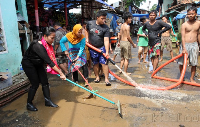 Calon Legistatif DPRD DKI Jakarta dari Partai Nasdem, Mutiara Indah Wirjasoekarta (kiri), mebersihkan sisa lumpur seusai terendam banjir bersama warga di Bukit Duri, Jakarta Selatan, Selasa (14/1/2014). Selain membersihkan sisa banjir, bantuan berupa sembako serta perlengkapan bayi juga disumbangkan untuk warga korban banjir. Aktual/Tino Oktaviano