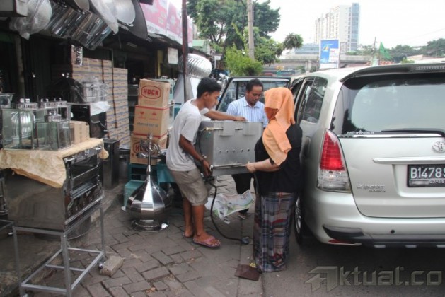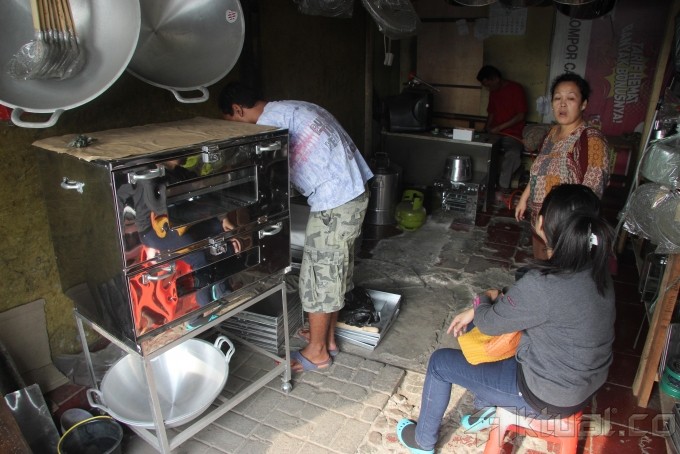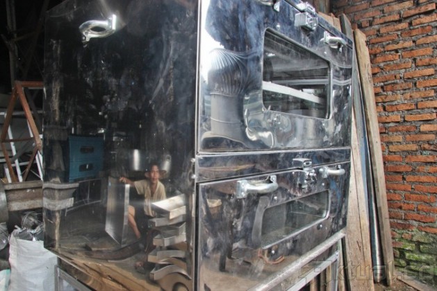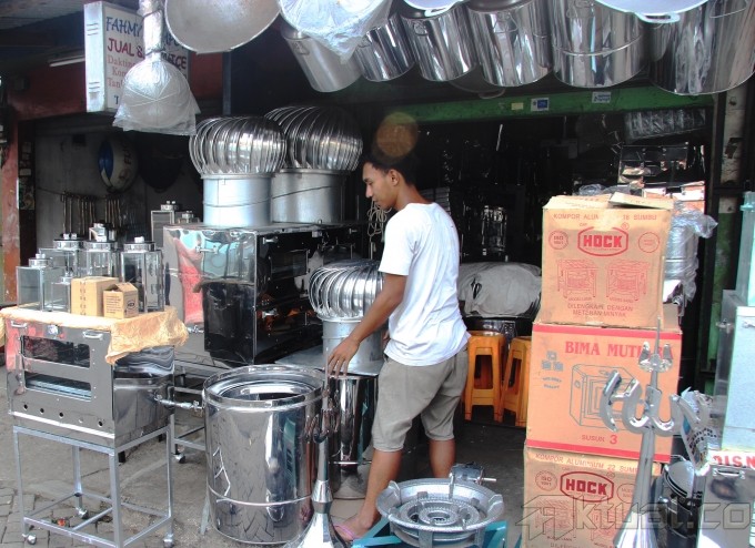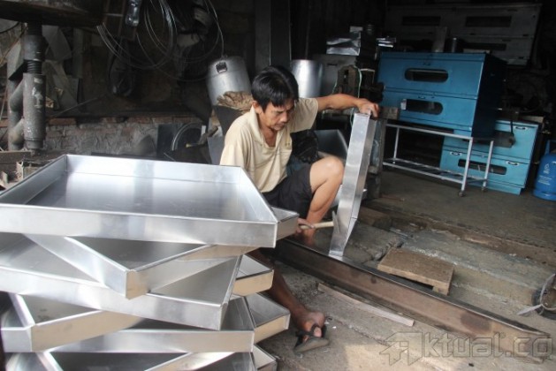 Pekerja membuat oven dengan bahan stainless steel di Jalan Dewi Sartika, Cawang, Jakarta Timur, Rabu (17/7). Aneka oven jongkok, loyang kue, kompor, toples hingga atap masjid dijual dikawasan ini. Untuk oven ada tipe oven jongkok satu pintu sampai 4 pintu. Biasanya oven ini digunakan untuk memanggang kue-kue kering, atau untuk memanggang bolu serta brownies. Harga yang ditawarkan mulai dari Rp 500 ribu hingga Rp 4 juta.Aktual/Tino Oktaviano