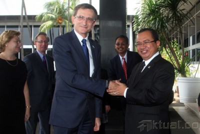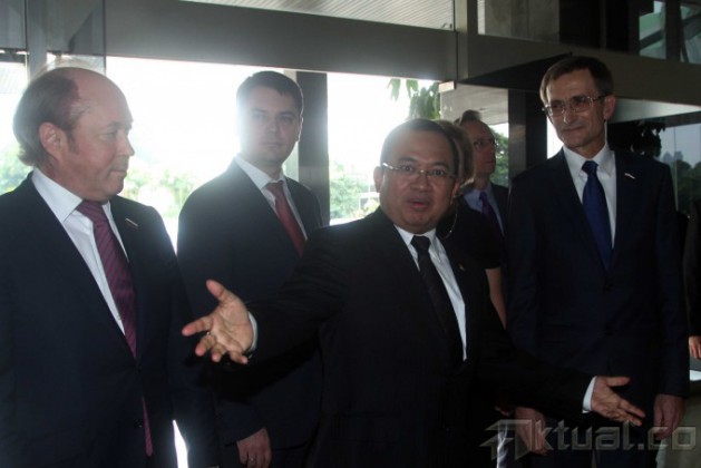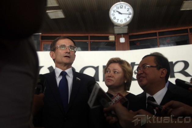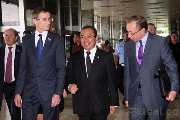 Wakil Ketua DPR Rusia Nikolai Levichev, disambut salam hangat Wakil Ketua DPR priyo Budi Santoso, saat berkunjung di gedung Parleman, Jakarta, Kamis (21/11/2013). Selain membicarakan hubungan kerjasama kedua negara kunjungan parlemen Rusia juga membicarakan mengenai masalah internasional seperti di Laut Cina Selatan, persoalan di Suriah, hingga masalah statuta kawasan serta masalah penyadapan yang dilakukan oleh Australia terhadap sejumlah pejabat Indonesia. Aktual/Tino Oktaviano