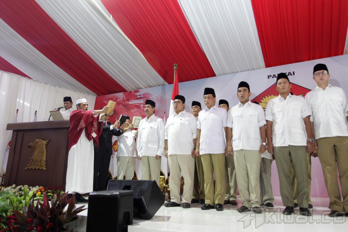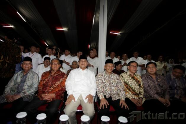 Ketua Umum (Ketum) sekaligus Dewan Pembina Partai Gerindra Prabowo Subianto (tengah) bersama Ketum PPP versi Muktamar Jakarta Djan Faridz (kanan) dan Ketua Majelis Pertimbangan PAN Amien Rais (kiri) melambaikan tangan saat menghadiri pelantikan Pengurus Pusat Partai Gerindra di Kantor DPP Gerindra, Jakarta, Rabu (8/4). Prabowo melantik sejumlah pengurus pusat diantaranya Dewan Pembina, Dewan Penasehat, Dewan Pakar Partai Gerindra. ANTARA FOTO/Muhammad Adimaja