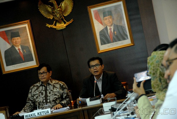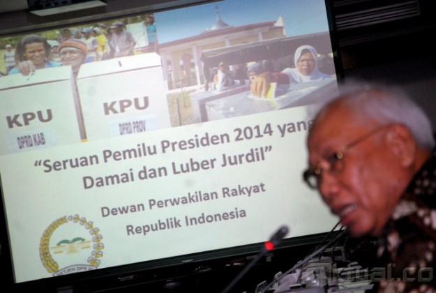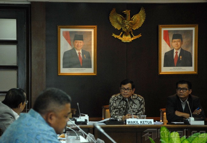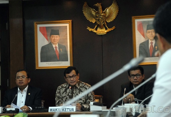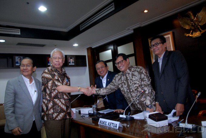 Wakil Ketua DPR Pramono Anung (kedua kanan) bersama Wakil Ketua DPR Priyo Budi Santoso (ketiga kanan) dan Ketua Komisi II DPR Agun Gunanjar Sudarsa (kanan), menyalami Ketua Dewan Pers Bagir Manan, saat akan melaksanankan pertemuan antara Pimpinan DPR dengan Dewan Pers dan sejumlah pemimpin redaksi media di Kompleks Parlemen, Jakarta, Rabu (25/6). Pertemuan tersebut untuk mengawasi jalannya pemilu presiden yang akan berlangsung pada 9 Juli 2014 mendatang. Aktual/Tino Oktaviano