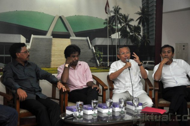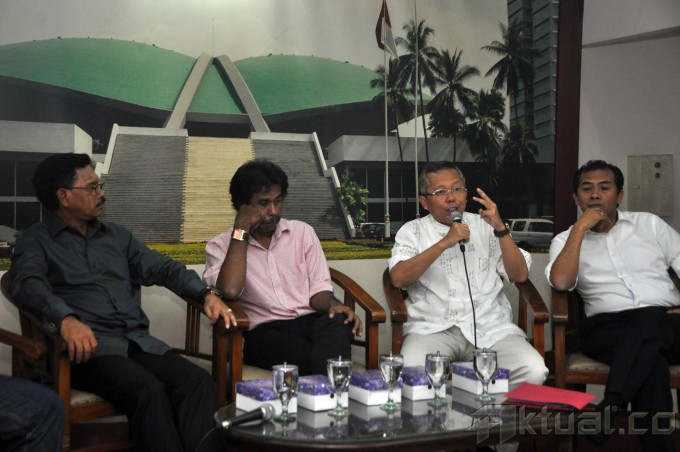 Anggota Fraksi PPP DPR RI Asrul Sani (kedua dari kanan) bersama Anggota Fraksi PDIP DPR RI Sukur Nababan (kanan), Pakar Hukum Tata Negara Margarito Kamis (kedua dari kiri) dan Anggota Fraksi NasDem DPR RI Johny G. Plate (kiri) menjadi narasumber pada diskusi Dilematikan Demokrasi yang bertema “Presiden Ajukan Calon Kapolri Baru dan Terbitkan Perppu KPK di Masa Reses DPR” di Pressrom DPR Kompleks Parlemen Senayan, Jakarta Selatan, Jumat (20/2/2015). Keputusan Jokowi yang batal melantik Komjen Pol Budi Gunawan ada yang menilai keputusan tersebut sudah tepat, namun ada juga yang menganggap Presiden Jokowi telah melanggar konstitusi. AKTUAL/JUNAIDI MAHBUB