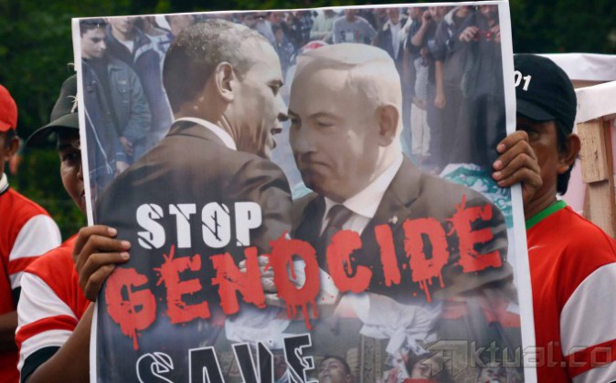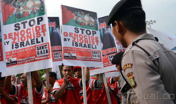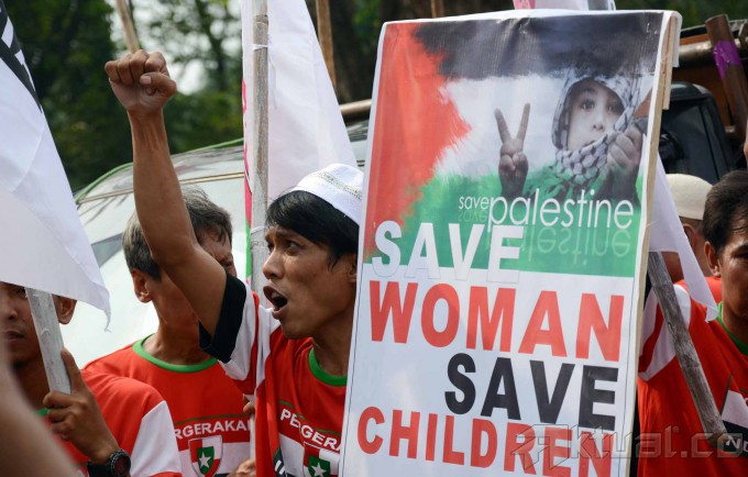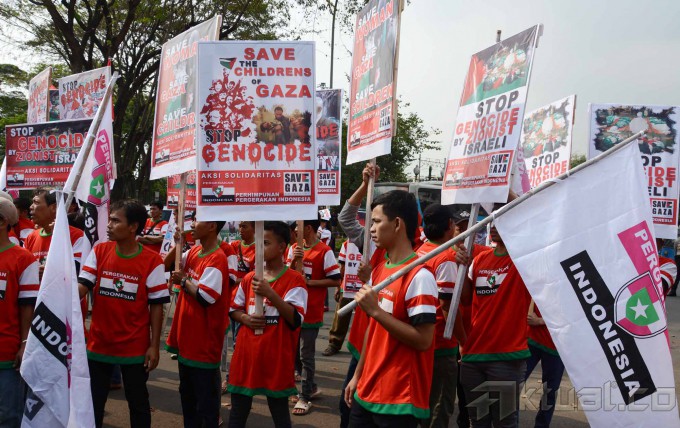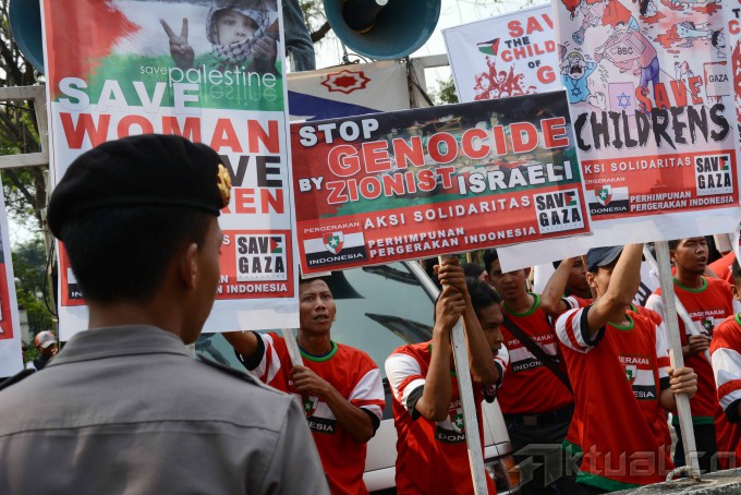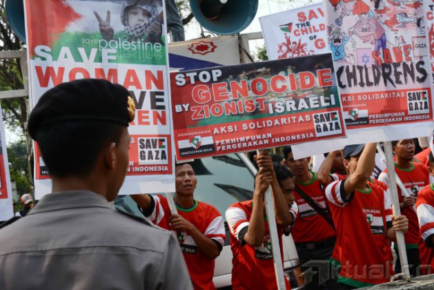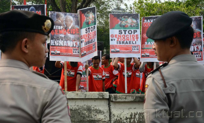 Puluhan massa yang tergabung dalam Perhimpunan Pergerakan Indonesia (PPI) melakukan aksi solidaritas Palestina di depan Kedutaan Besar Amerika Serikat (AS), Jakarta, Jumat (18/7/2014). Mereka menuntut supaya Amerika Serikat (AS) menekan Israel untuk menghentikan serangan ke wilayah Gaza, Palestina. Aktual/Tino Oktaviano