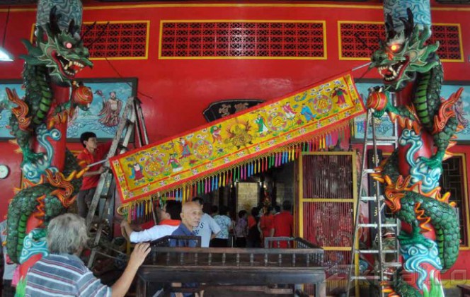 Warga Tionghoa membersihkan pernak pernik Vihara jelang perayaan Tahun Baru Imlek 2565 di Vihara Amura Bhumi, Jakarta, Kamis (23/1/2014). Bersih-bersih di komplek vihara ini merupakan ritual seminggu sebelum perayaan Imlek. Aktual/Tino Oktaviano