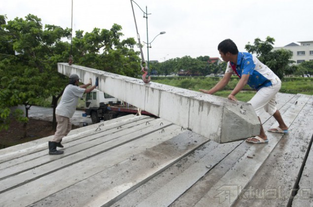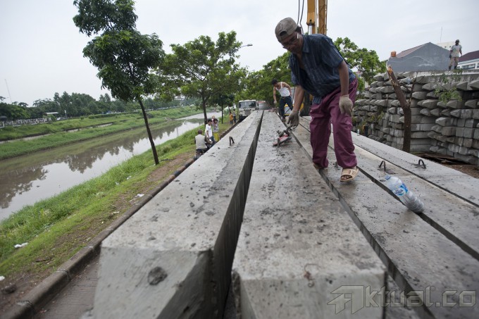 Pekerja memindahkan beton untuk proyek pembangunan sodetan Kali Cilwung ke Kanal Banjir Timur (KBT) di sepanjang KBT, Jakarta, Kamis (19/2). Sodetan tersebut berfungsi untuk mengalihkan sebagian debit banjir Kali Ciliwung ke KBT sehingga akan mengurangi potensi banjir pada beberapa kawasan hilir Kali Ciliwung. ANTARA FOTO/Rosa Panggabean