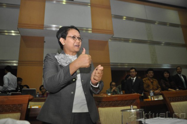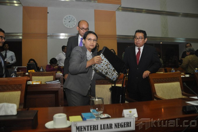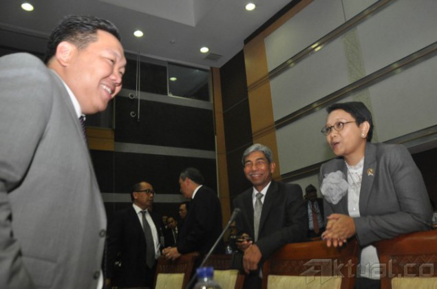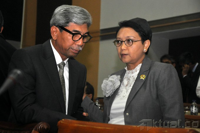 Menteri Luar Negeri, Retno Marsudi berbincang dengan Wakil Menlu Abdurrahman Mohammad Fachir saat akan memulai rapat bersama Komisi I DPR RI di Komplek Parlemen, Senayan, Jakarta, Selasa (9/6/2015). Rapat Kerja tersebut membahas perkembangan realisasi program kerja kemenlu dan laporan realisasi anggaran tahun 2015 Triwulan I juga perkembangan isu-isu strategis di bidang Luar Negeri dan pembahasan RKA dan RKP-KL Kementerian Luar Negeri TA 2016. AKTUAL/JUNAIDI MAHBUB