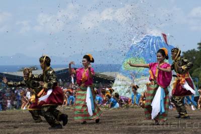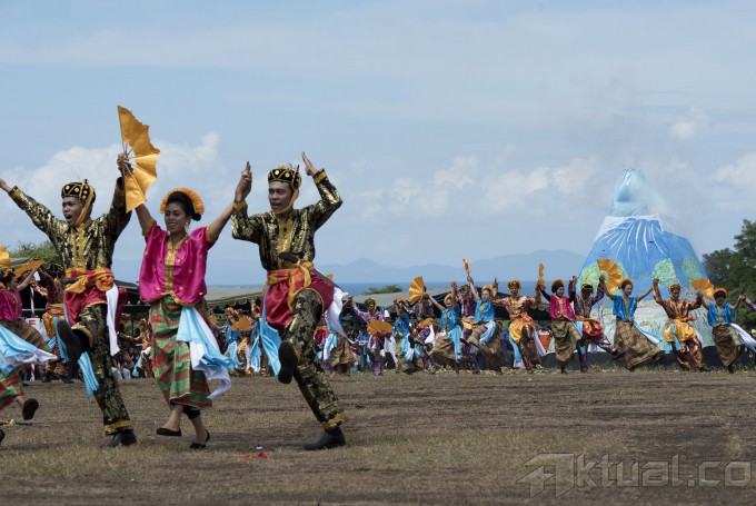 Ratusan penari menarikan tarian khas Rai Saidah saat peringatan dua abad letusan Gunung Tambora di Padang Sabana Doro Ncanga, Dompu, Nusa Tenggara Barat, Sabtu (11/4). Tarian tersebut sebagai pembuka acara Tambora Menyapa Dunia dan peresmian kawasan Gunung Tambora menjadi Taman Nasional Gunung Tambora (TNGT). ANTARA FOTO/M Agung Rajasa