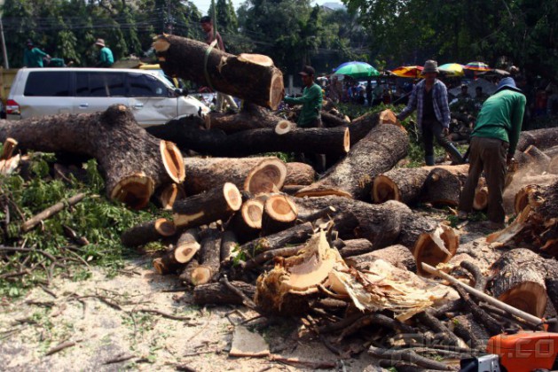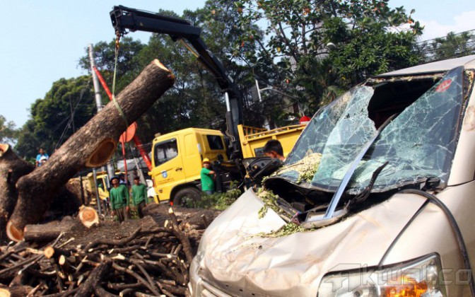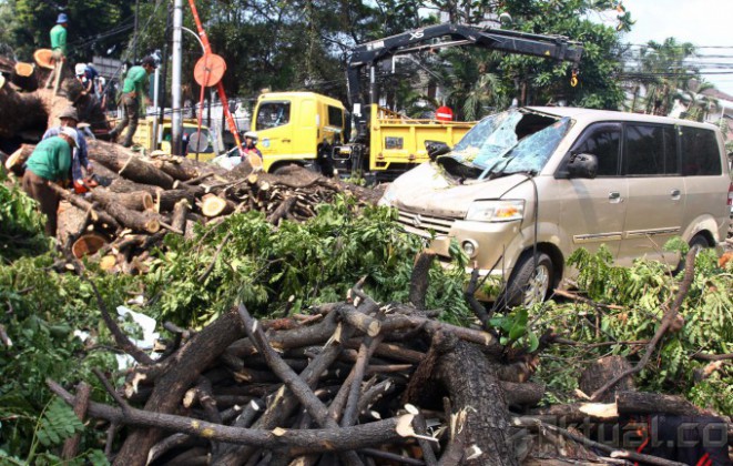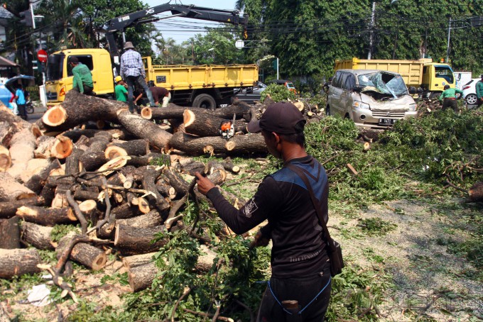 Petugas dari Dinas Pertamanan dan Pemakaman Provinsi DKI Jakarta memotong pohon tua yang tumbang di halaman Masjid Sunda Kelapa, Menteng, Jakarta Pusat, Sabtu (25/10/2014). Tidak ada korban akibat kejadian tersebut, namun 6 gerobak pedagang rusak dan 3 buah mobil yang tengah parkir rusak. AKTUAL/TINO OKTAVIANO