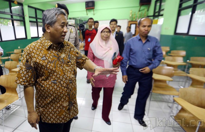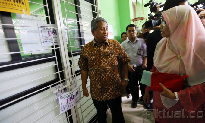 Menteri Pendidikan dan Kebudayaan (Mendikbud) Muhamad Nuh, melakukan inspeksi mendadak (sidak) untuk meninjau kesiapan Ujian Nasional (UN) di SMAN 35, Bendungan Hilir, Jakarta Pusat, Minggu (13/4/2014). Sidak ini bertujuan memantau kesiapan sekolah berikut logistik, seperti kecukupan naskah dan instrumen lain penunjang UN besok. M Nuh meminta kepada para peserta UN agar percaya diri dan giat belajar, sehingga nantinya mendapat kemudahan saat mengerjakan soal UN. Aktual/Tino Oktaviano