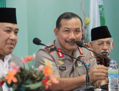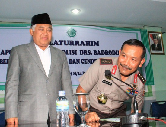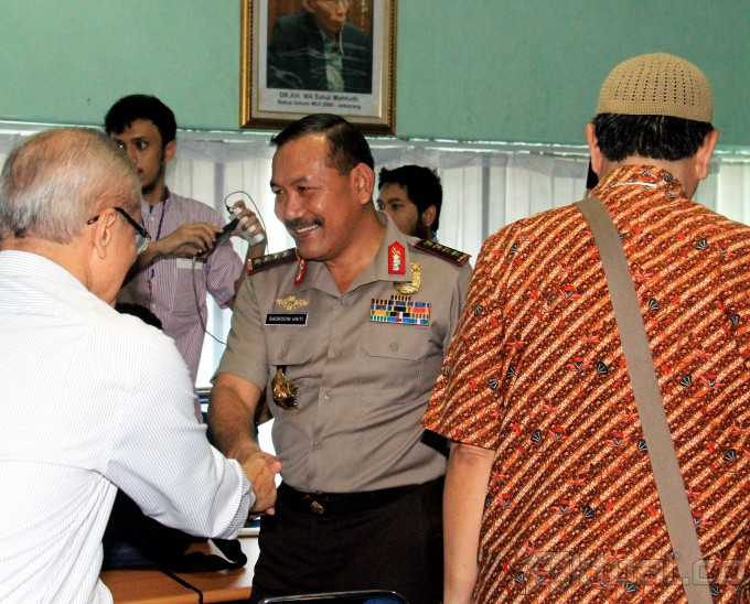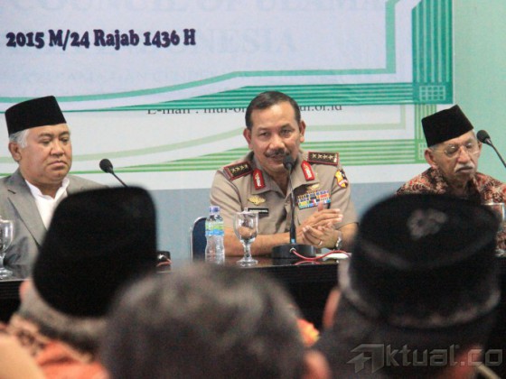 Kapolri Badrodin Haiti (tengah) bersama Ketua Umum Majelis Ulama Indonesia Din Syamsuddin (kiri) dan Ketua Bidang Ukhuwah Islamiyah MUI Umar Shihab mengikuti acara “Silaturahim Kapolri Bersama Ulama, Zu’ama dan Cendekiawan Muslim” di gedung MUI, Jakarta Pusat, Rabu (13/5/2015). Kapolri mengingatkan pentingnya kerjasama Polri dan ulama dalam menanggulangi berbagai permasalahan seperti terorisme. AKTUAL/MUNZIR